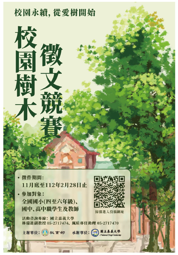 (二)競賽形式:以校園原生種樹種為主題,拍攝至少1,600像素寬或高之照片至多5張,以短文、散文、詩詞等方式闡述樹木故事,並介紹學校之愛樹護樹行動,文字與圖片需進行排版設計。