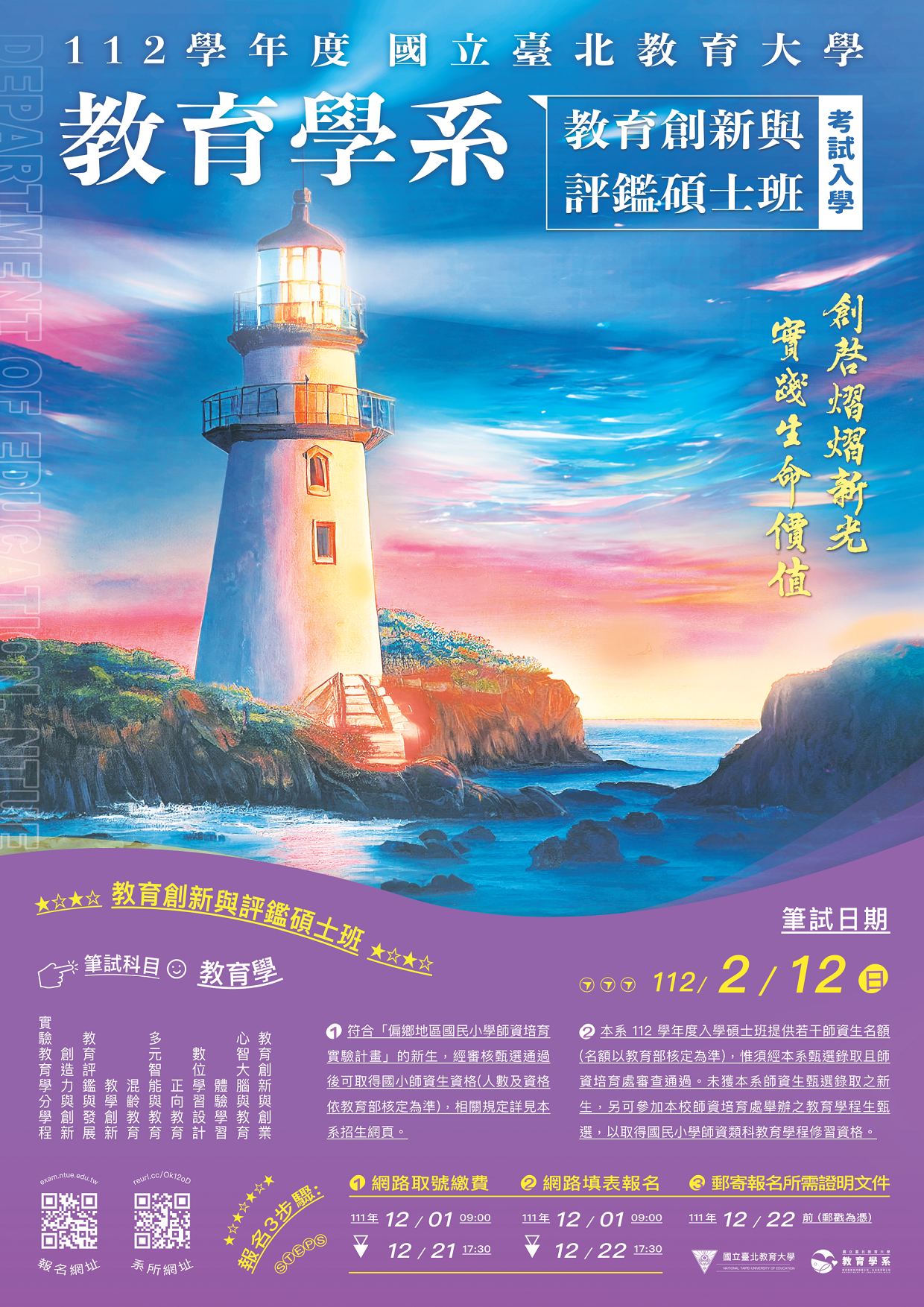 二、教育創新與評鑑碩士班考試入學筆試日期為112年2月 12日(星期日)。筆試科目:教育學。