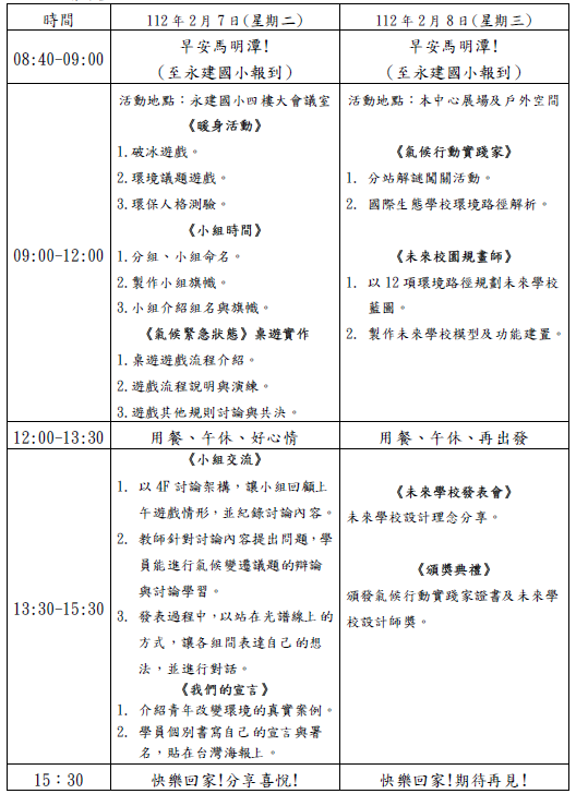 (一)活動時間:112年2月7日(星期二)及2月8日(星期三) 上午9時至下午3時30分。