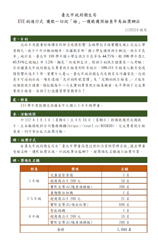 為鼓勵家長及早帶孩子完成護眼護照檢查,以掌握孩子視力健康,特辦理旨揭抽獎活動,凡自今(112)年1月1日至4月16日期間,完成護眼護照檢查之學童,均獲抽獎資格。