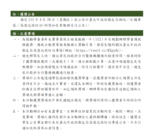 抽獎辦法,請參閱(網址:https://reurl.cc/a1v0xZ)/主題專區/兒童及青少年保健/ 臺北市高度近視防治