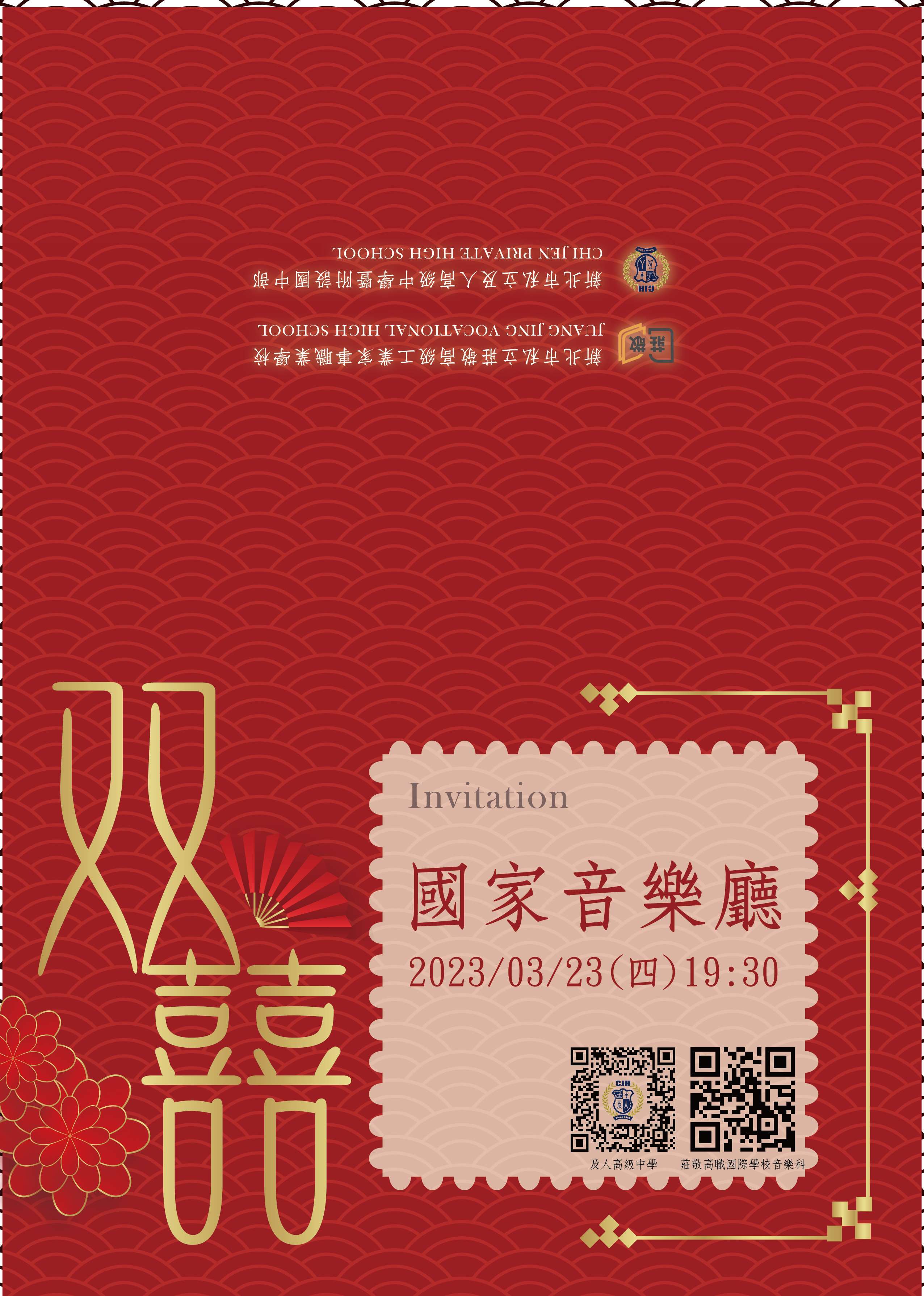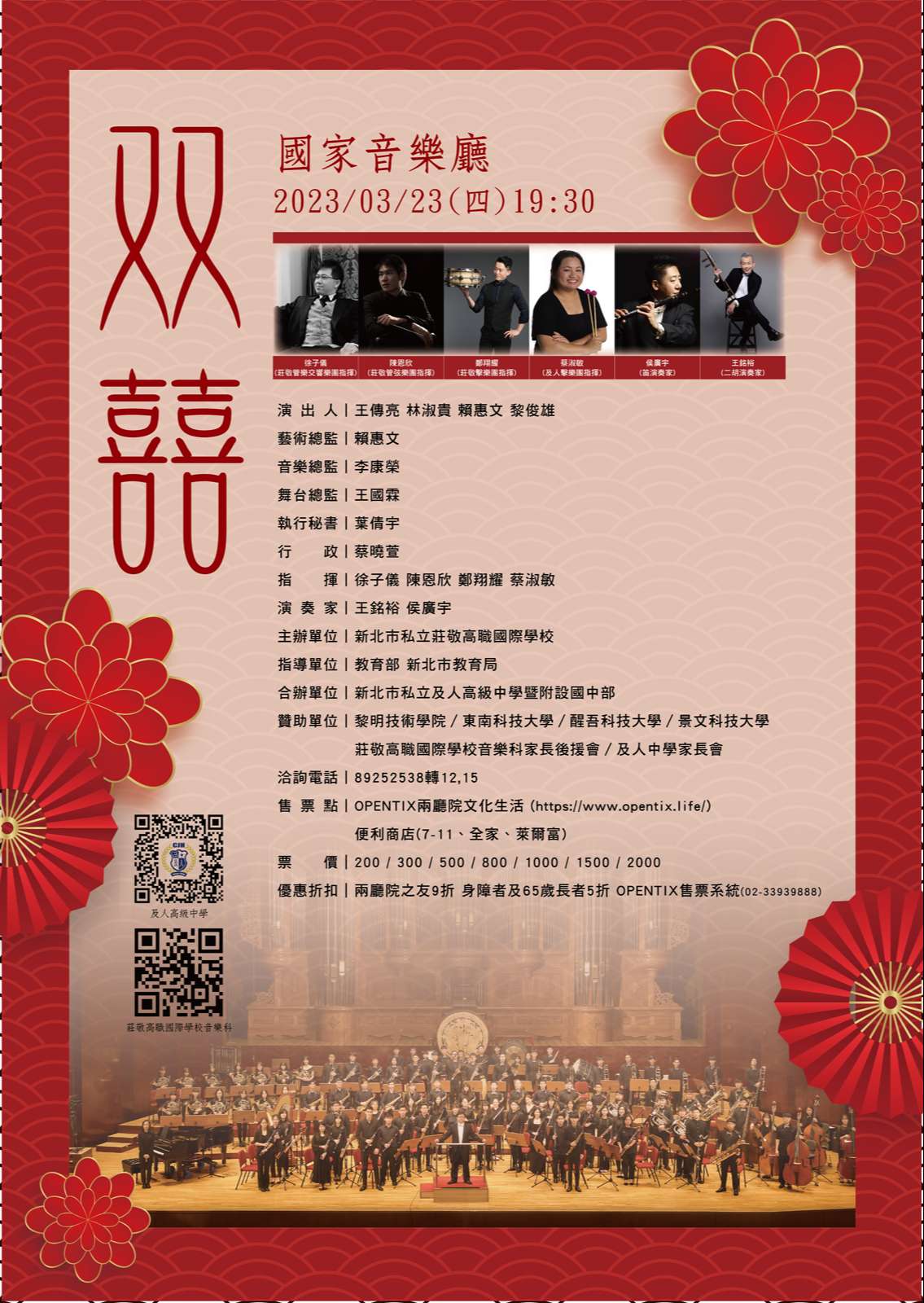 新北市私立及人高級中學擊樂團,訂於112年3月23日 (星期四)於國家音樂廳舉辦「双囍」音樂會。