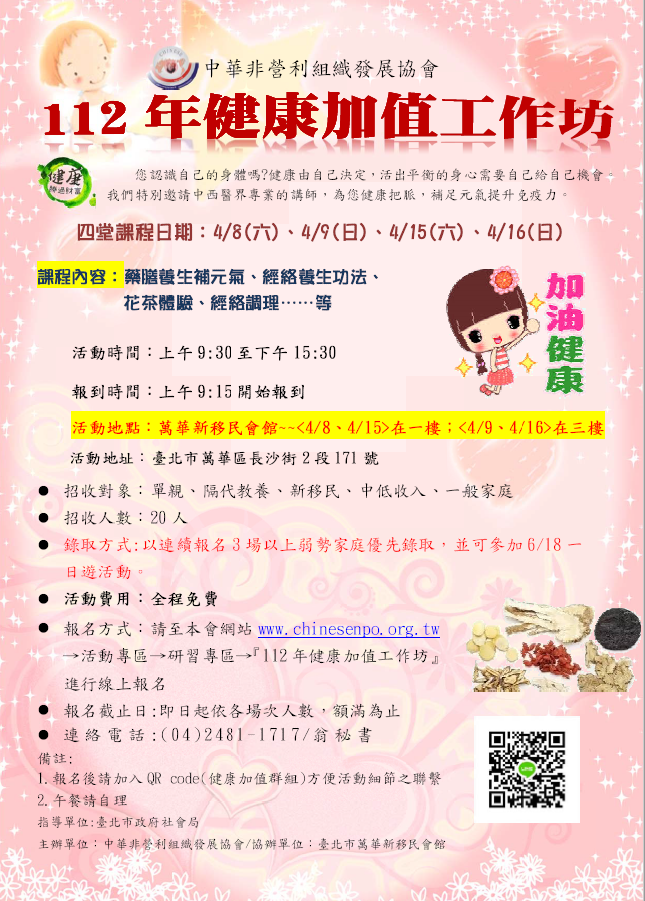 報名方式:請至本會網站www.chinesenpo.org.tw→活動專區→研習專區→『112年健康加值工作坊』進行線上報名