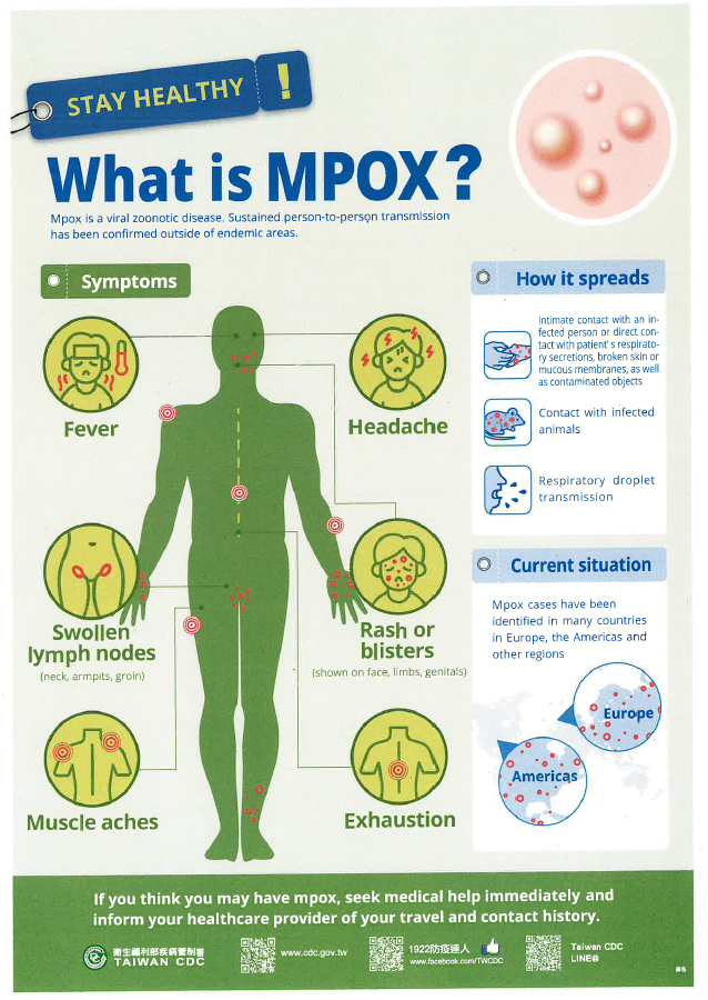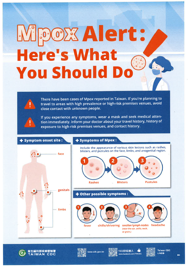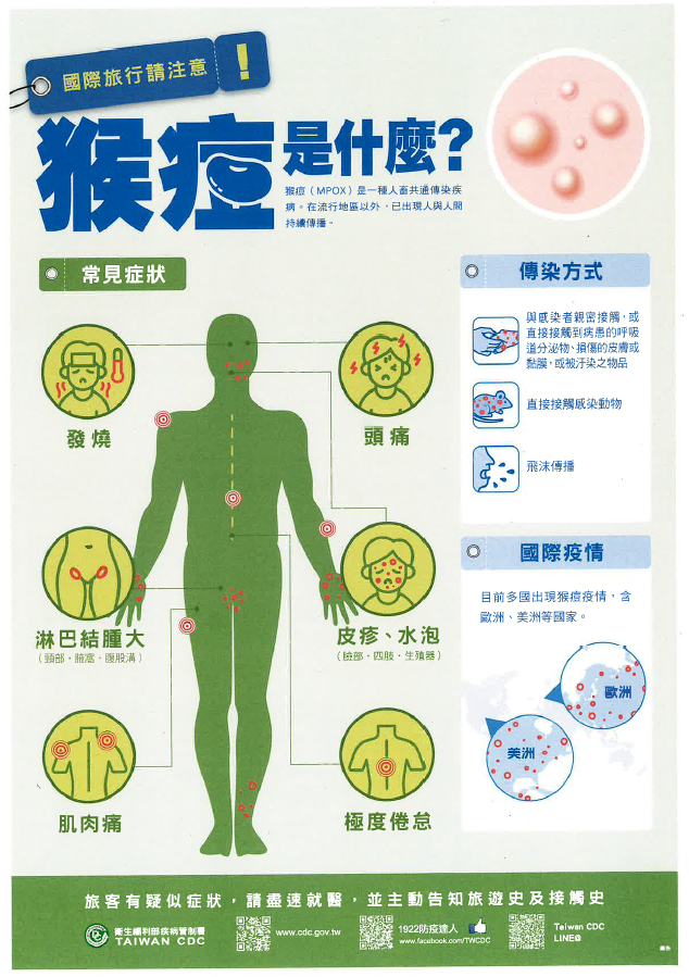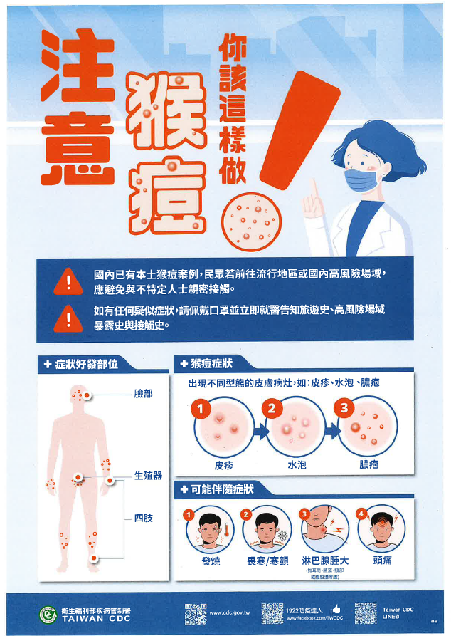 (二)疑似猴痘感染症狀,如:出現不同型態的皮膚病灶 (如:皮疹、斑疹、斑丘疹、水泡、膿疱等,於臉部、四肢及生殖器等部位),可能伴隨症狀,如:發燒(≥38°C)、畏寒/寒顫、出汗、頭痛、肌肉痛、背痛、淋巴腺腫大(如耳周、腋窩、頸部或腹股溝等處),如有相關症狀,請佩戴口罩並就醫。