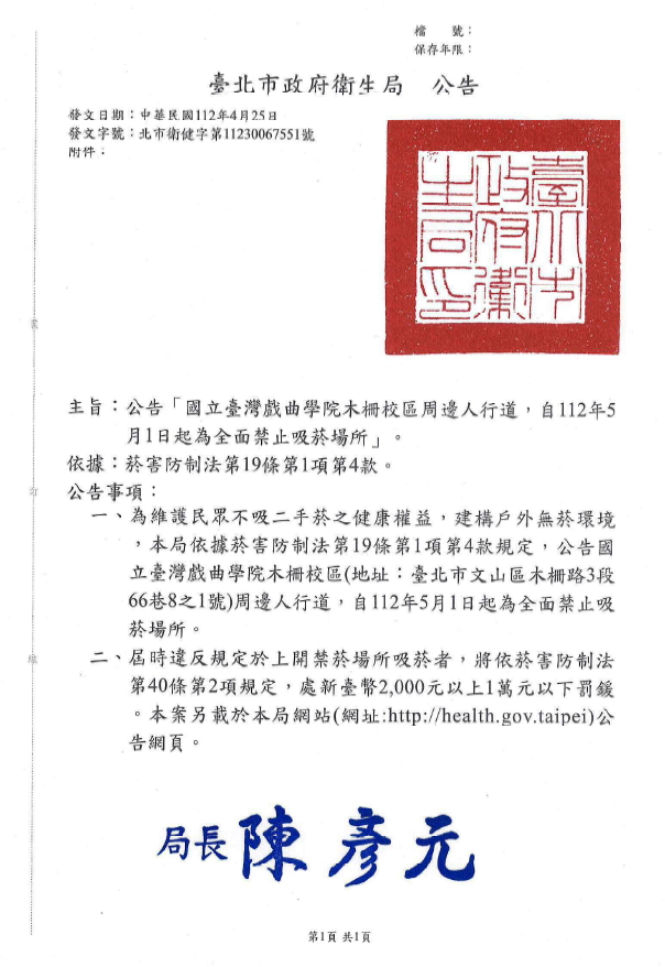 二、為維護民眾不吸二手菸之健康權益,建構戶外無菸環境,本局依據菸害防制法第19條第1項第4款規定,公告國立臺灣戲曲學院木柵校區(地址:臺北市文山區木柵路3段66巷8之1號)周邊人行道,自112年5月1日起為全面禁止吸菸場所。