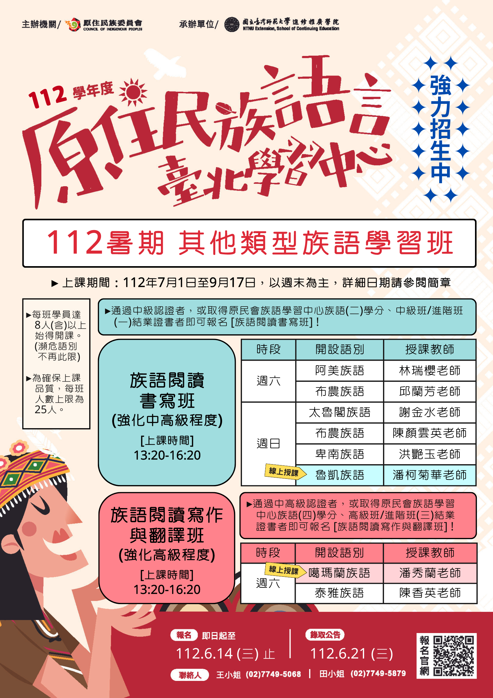 二、為使更多人認識原住民族文化及加強族語能力,臺師大原住民族語言臺北學習中心特辦理「原住民族語言學習班」,藉以傳承並推廣原住民族語言及文化,培育更多通曉原住民族語之人才。