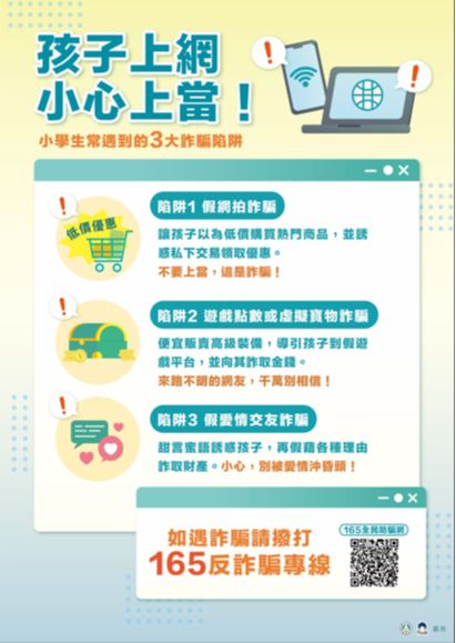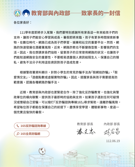 製作「教育部與內政部~致家長的一封信」(含反詐騙圖卡)國小版,