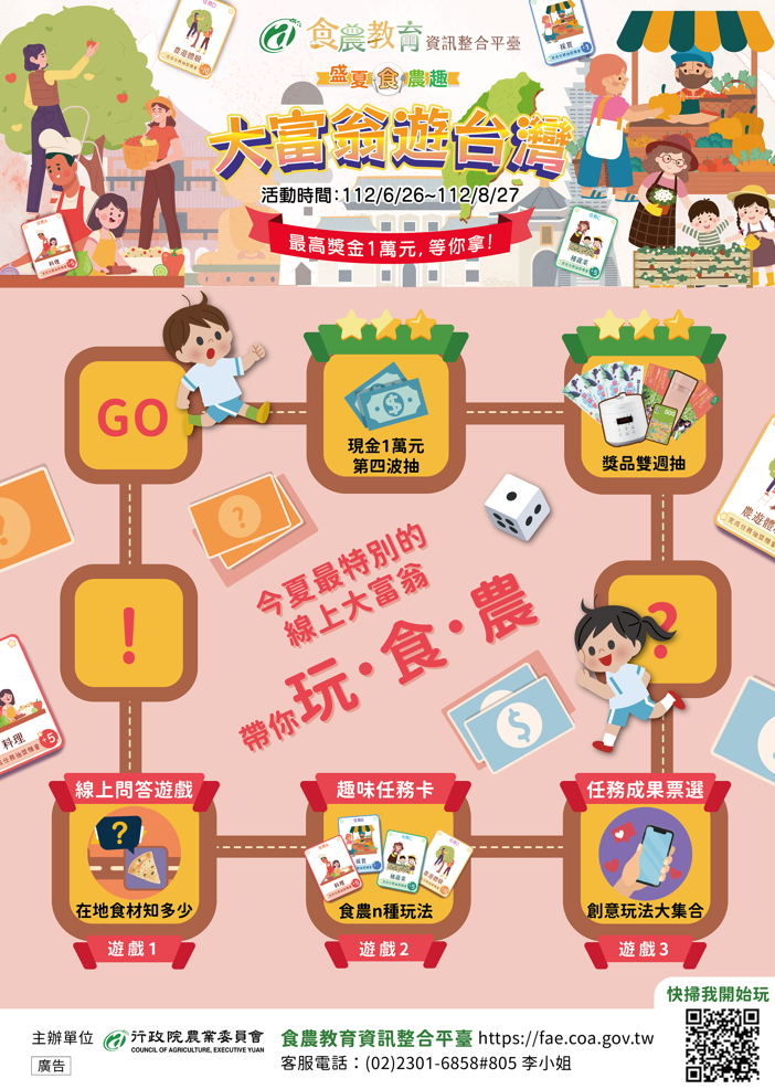 為推播應用「臺灣農產地圖」單元內容,該會於112年6月26日至8月27日辦理旨揭活動(網址:https://fae.coa.gov.tw/2023event/),歡迎踴躍參加。