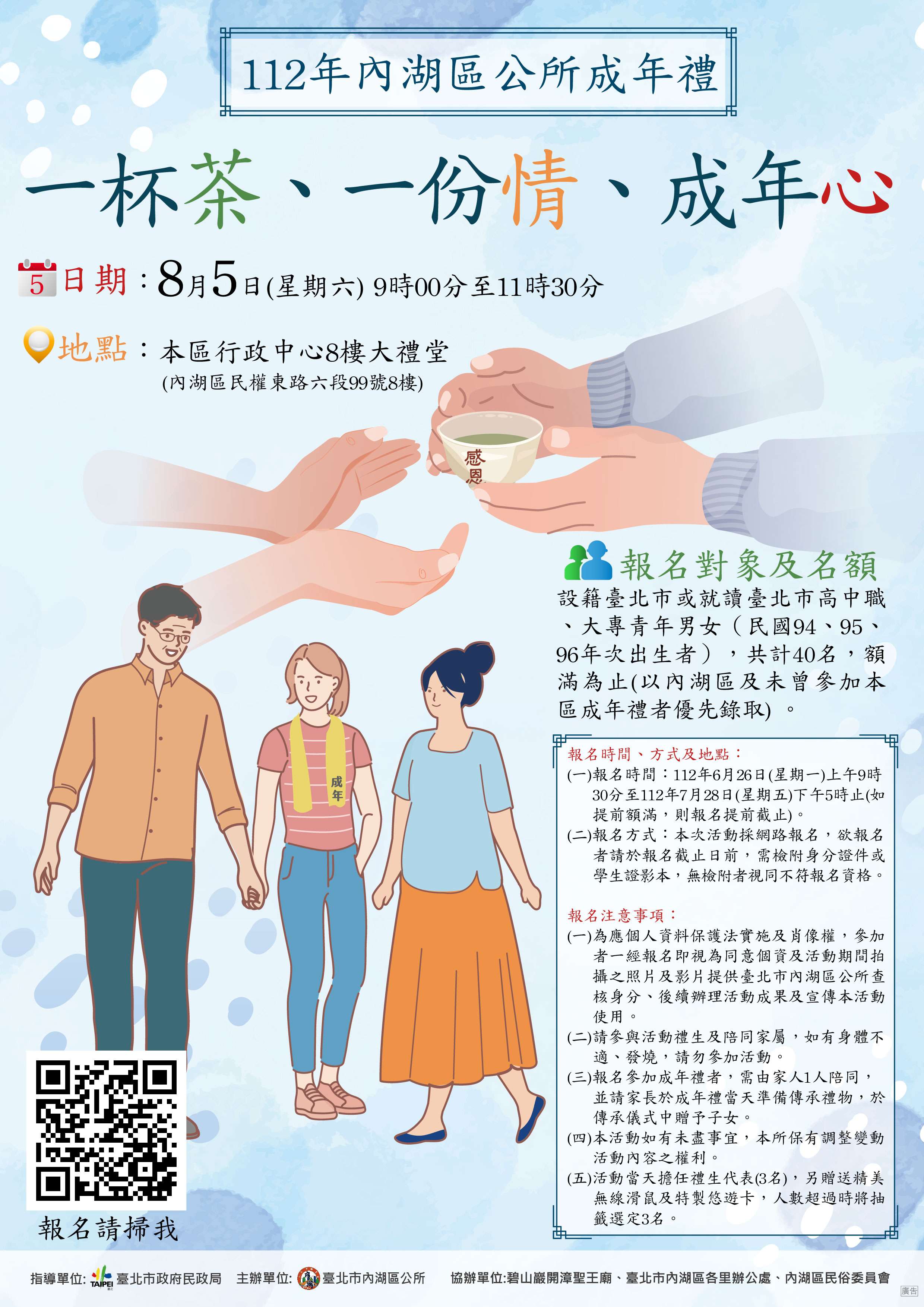 「臺北市內湖區公所112年度成年禮活動,訂於8月5日(星期六)上午9時舉辦,凡成功 報名並全程參與之禮生,可獲得成年禮紀念郵票、智慧 巾、茶具組及禮券600元各1份。活動內容包含茶道文化體 驗、穿越智慧門、行感恩禮及成年禮專屬拍貼機,即日起 開放報名,歡迎設籍或就讀於臺北市之青年男女(民國94 至96年次)踴躍報名參加,內容豐富,精彩可期。」