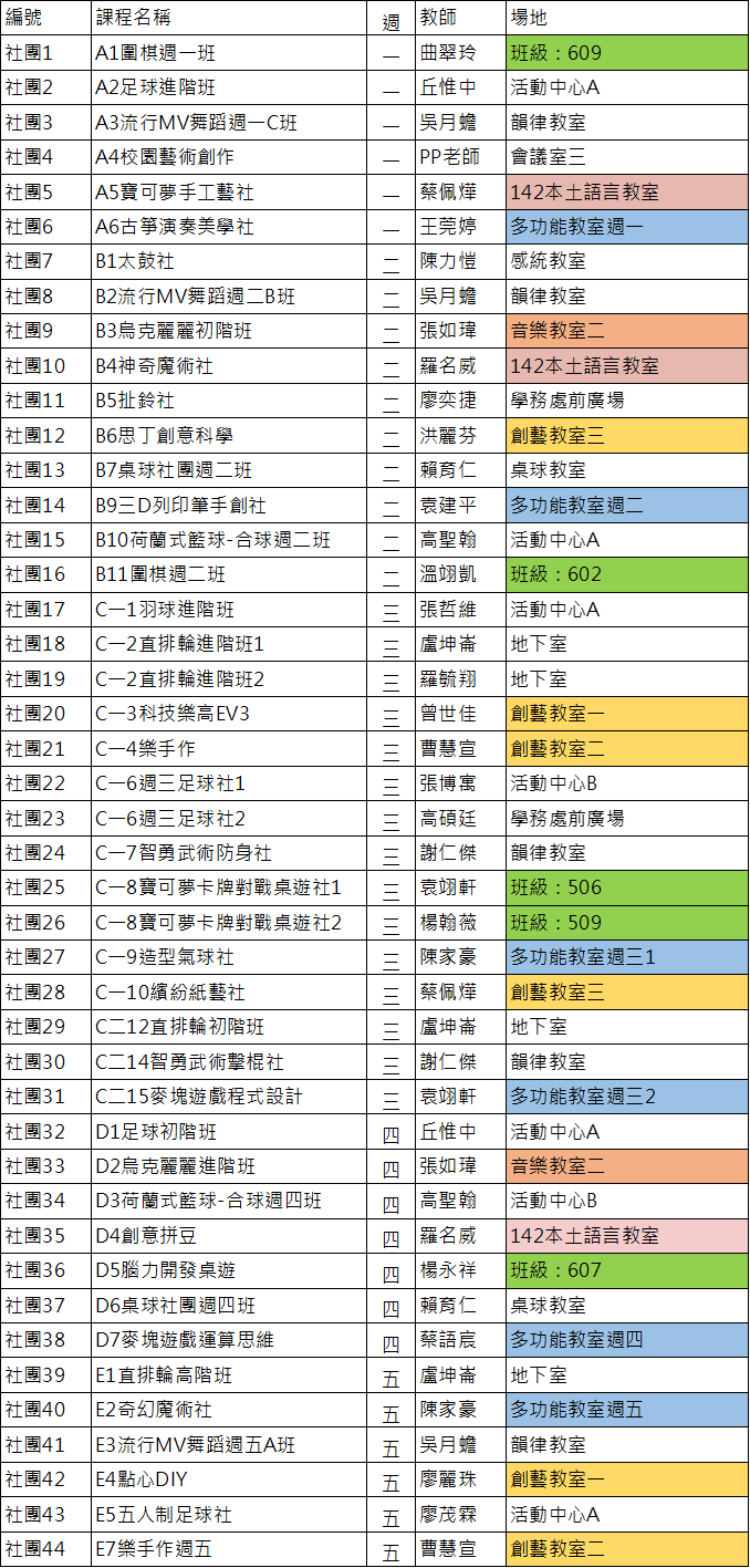 2.社團上課地點如下(第一次上課請至學務處前廣場集合,將由社團老師帶至上課地點上課):