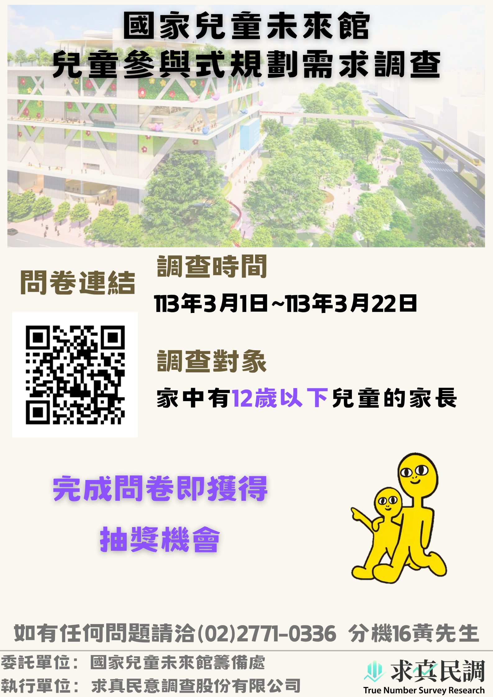 四、調查對象為家中有12歲以下兒童之家長,113年3月22日前完成問卷即獲得抽獎機會。