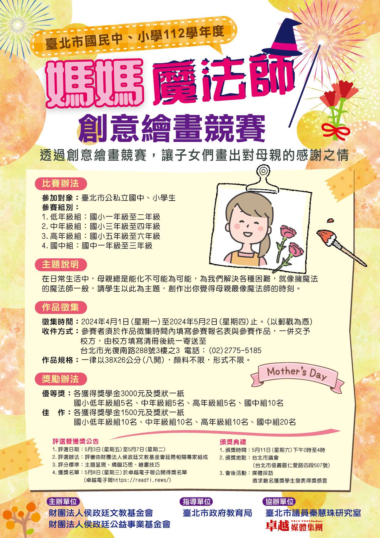 二、財團法人侯政廷文教基金會及財團法人侯政廷公益事業基 金會辦理「媽媽魔法師」創意繪畫競賽,透過創意繪畫競 賽,畫出對母親的感謝之情。