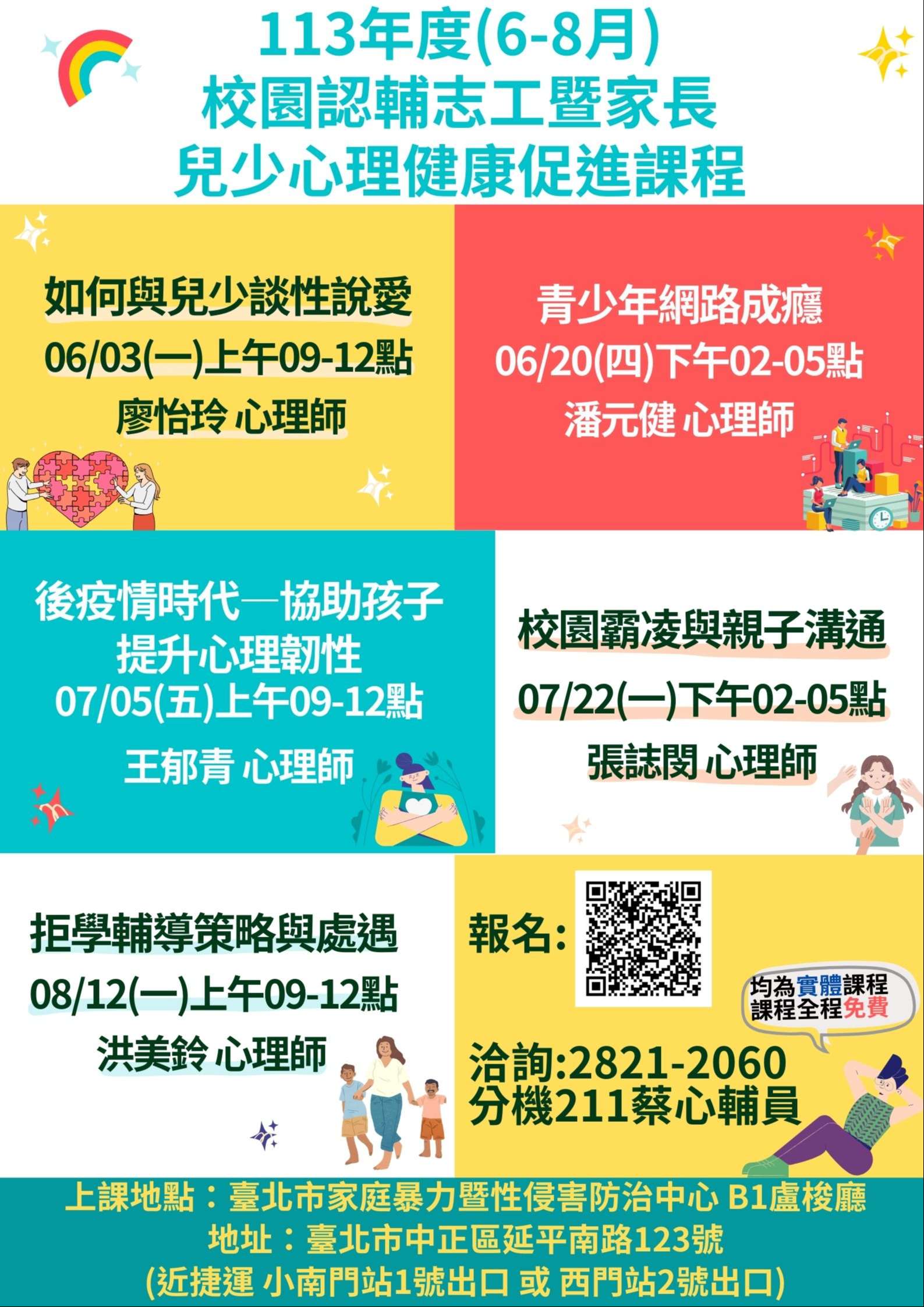 二、為增進校園認輔志工兒少相關心理衛生知能,以及家長照 顧特殊兒少之親職功能,爰辦理旨揭課程,113年6月至8月 課程資訊請協助公告海報於貴單位官網。