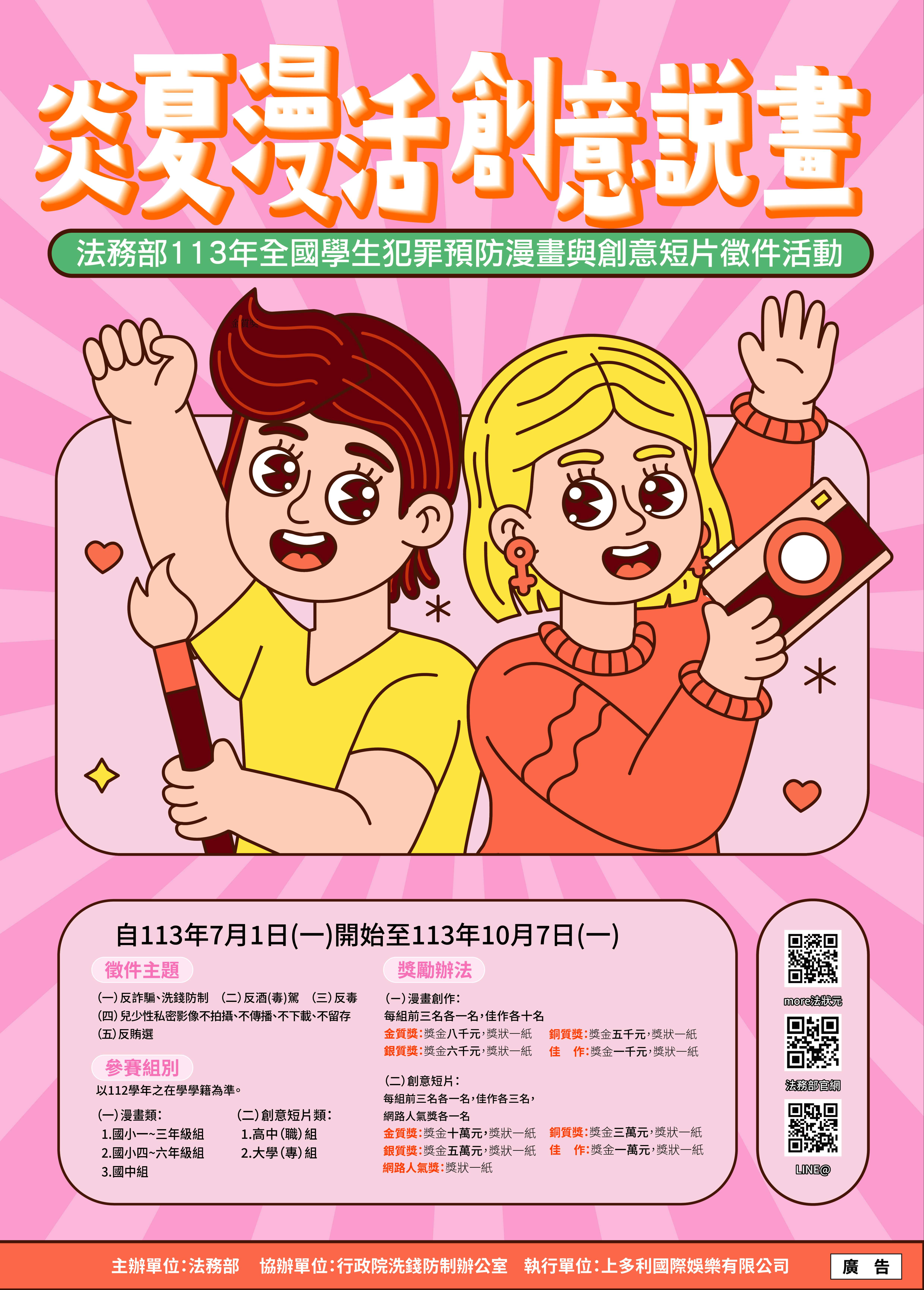轉知法務部辦理「炎夏『漫』活,創意說『畫』」113年 全國學生犯罪預防漫畫與創意短片徵件活動辦法,詳細內容請參閱附件。