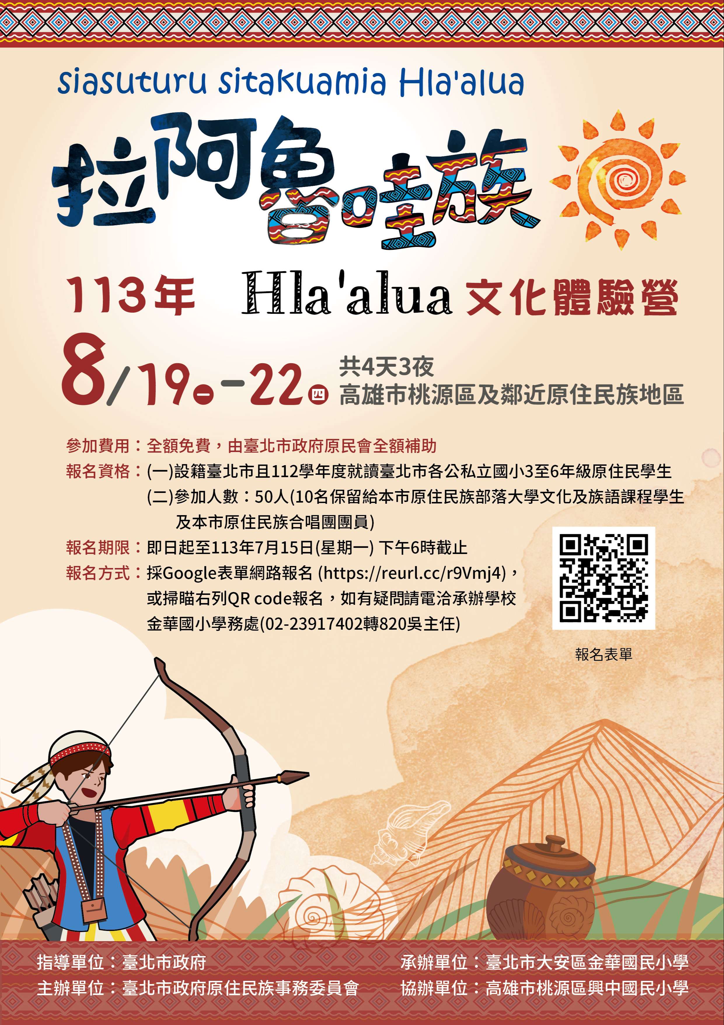 二、活動說明如下(詳如附件): (一)活動日期:113年8月19日(一)至8月22日(四),共4 天3夜。 (二)活動地點:高雄市桃源區及鄰近原住民族地區 (三)活動內容:拉阿魯哇族文化體驗活動,包含部落參訪、 團康活動、傳統工藝及歌舞等部落生活體驗。 (四)報名日期:自公告日起至113年7月15日(一)下午6時止,採網路報名。 (五)報名網址:https://reurl.cc/r9Vmj4,報名如有疑問, 請電洽金華國小學務處吳主任(02-23917402轉820)。 (六)參加人數及對象: 1、報名資格:須設籍且就讀本市各公私立國小3至6年級 原住民學生(其原住民身分以父母其中一方具原住民 身分者即符合資格)。 2、報名人數:原住民學生50人,額滿由承辦單位金華國 小依據報名名單,以電腦隨機抽籤錄取。 3、其中保留10名予本市原住民族部落大學文化及族語課 程學生及本市原住民族合唱團團員。