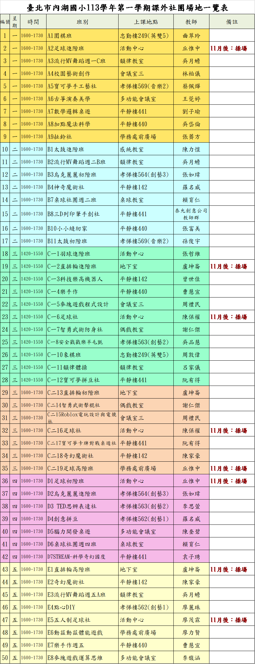 一、上課時間:自113.8.30(五)~114/1/17(五),共21週。扣除假日:09/17(二)中秋節、10/10(四)國慶日、11/25(一)運動會補假、1/1(三)元旦,補課日社團不上課。