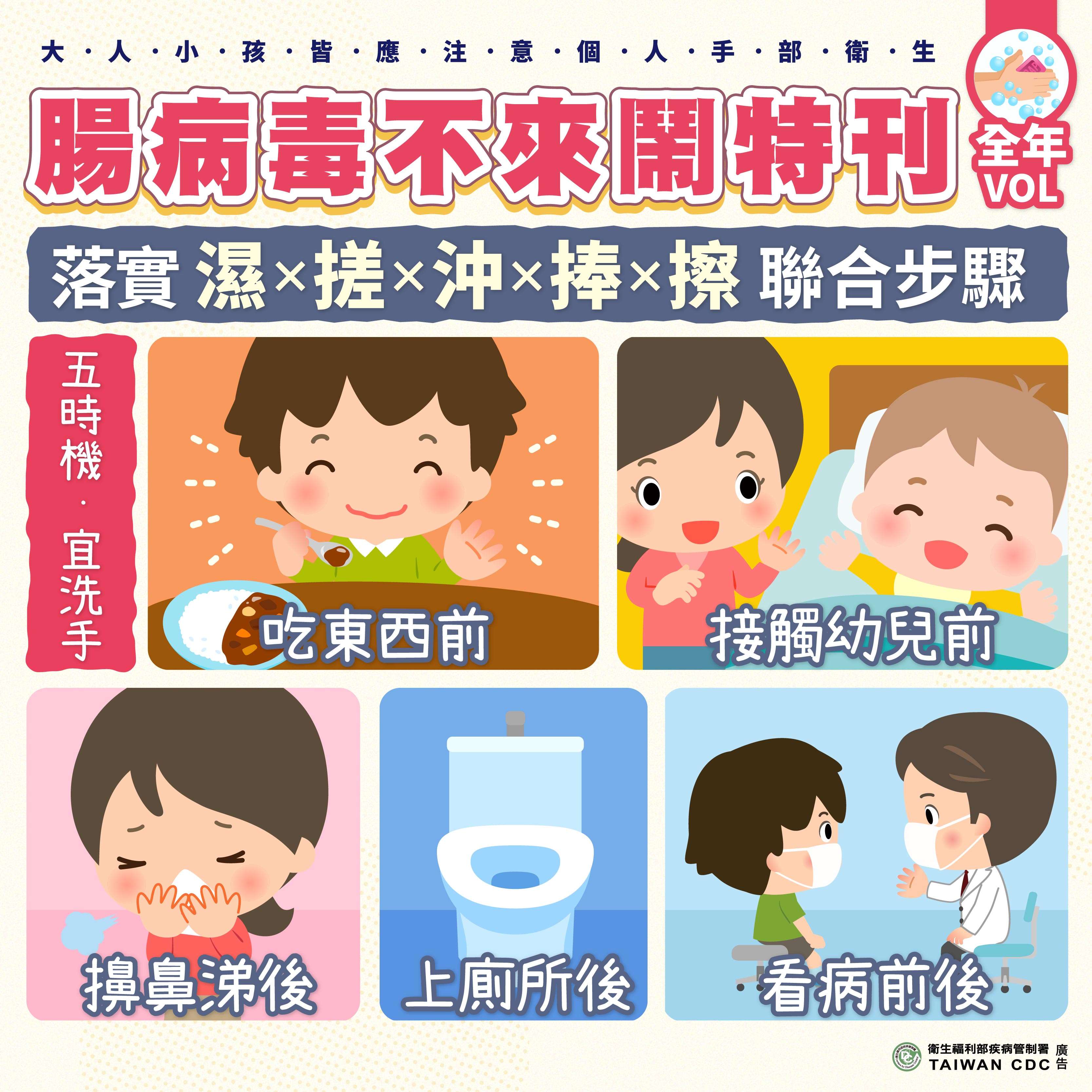 (一)正確洗手5步驟(濕搓沖捧擦),全家一起來,遠離腸病毒。