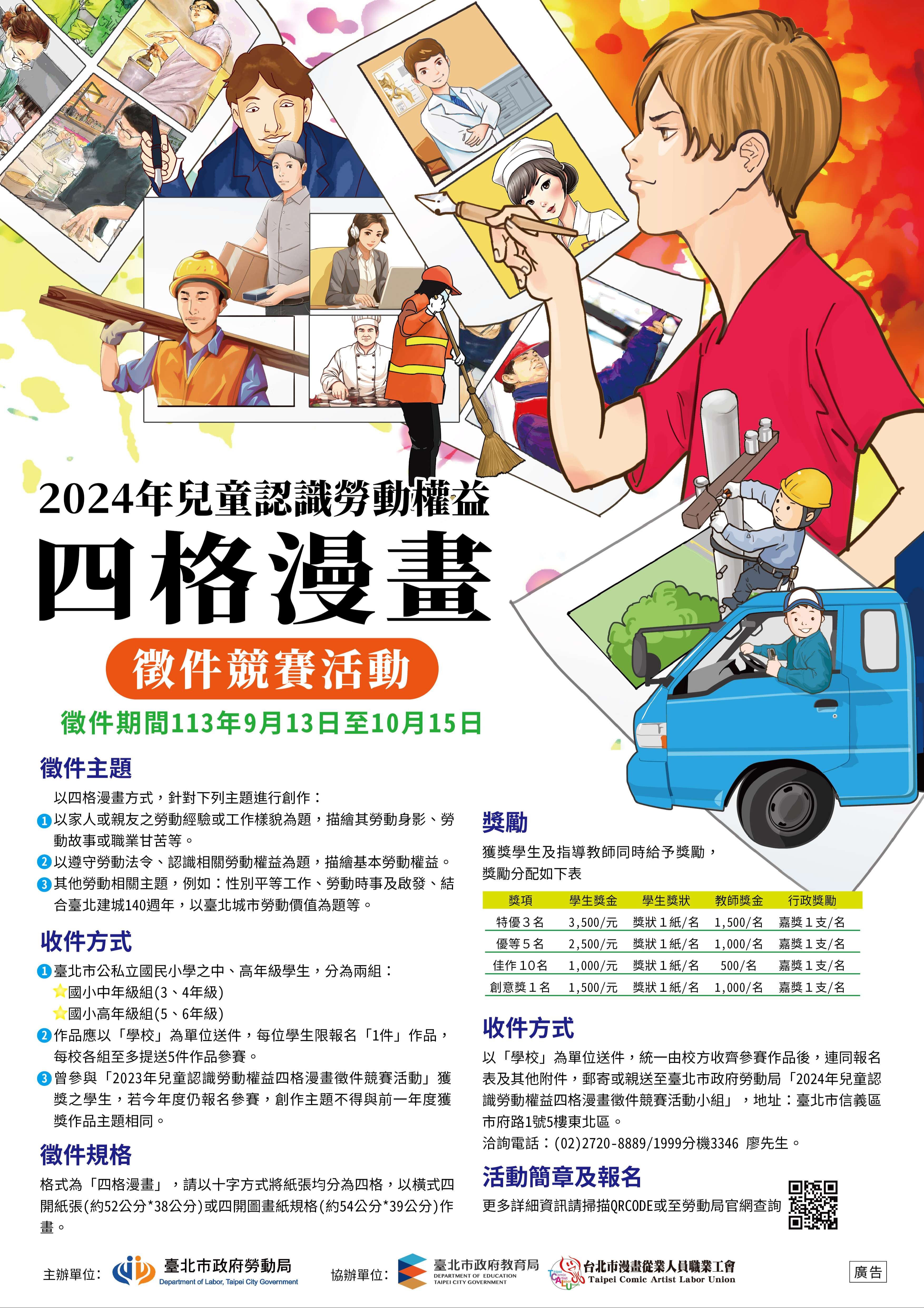 二、旨揭活動簡章重點資訊如下: (一)徵件期間:113年9月13日至10月15日。 (二)徵件對象:臺北市公、私立國民小學中、高年級學生。 (三)徵件組別及件數:1、分為「中年級組」(3、4年級)及「高年級組」(5、 6年級)。 2、作品應以「學校」為單位送件,每位學生限報名「1 件」作品,每校各組至多提送5件作品。 3、曾參與「2023年兒童認識勞動權益四格漫畫徵件競賽 活動」獲獎之學生,若今年度仍報名參賽,創作主題 不得與前一年度獲獎作品主題相同。 (四)徵件主題:以四格漫畫方式(限橫式四開紙張或圖畫 紙),針對下列主題進行創作: 1、以家人或親友之勞動經驗或工作樣貌為題,描繪其勞 動身影、勞動故事或職業甘苦等。 2、以遵守勞動法令、認識相關勞動權益為題,描繪基本 勞動權益,如:勞工加班雇主應給加班費、雇主應為 員工投勞保及提撥勞工退休金、拒絕職場過勞、打工 應注意之勞動權益等。 3、其他勞動相關主題,例如:性別平等工作、勞動時事 及啟發等;結合臺北建城140週年,以臺北城市勞動價 值為題,例如臺北勞動故事、臺北職業演化史、臺北 職業甘苦、臺北傳統職業樣態(如永樂布業)、臺北 現代職業樣態等。 (五)獎勵: 1、分別就「中年級組」及「高年級組」之獲獎學生擇特 優3名、優等5名、佳作10名、創意獎1名,各頒予每名 得獎者獎金3,500元、2,500元、1,000元、1,500元及 獎狀。2、指導教師按獎項頒予獎金1,500元、1,000元、500元、 1,000元及行政獎勵嘉獎1支。 3、提送學生作品之學校承辦人員,給予行政獎勵嘉獎1 支。