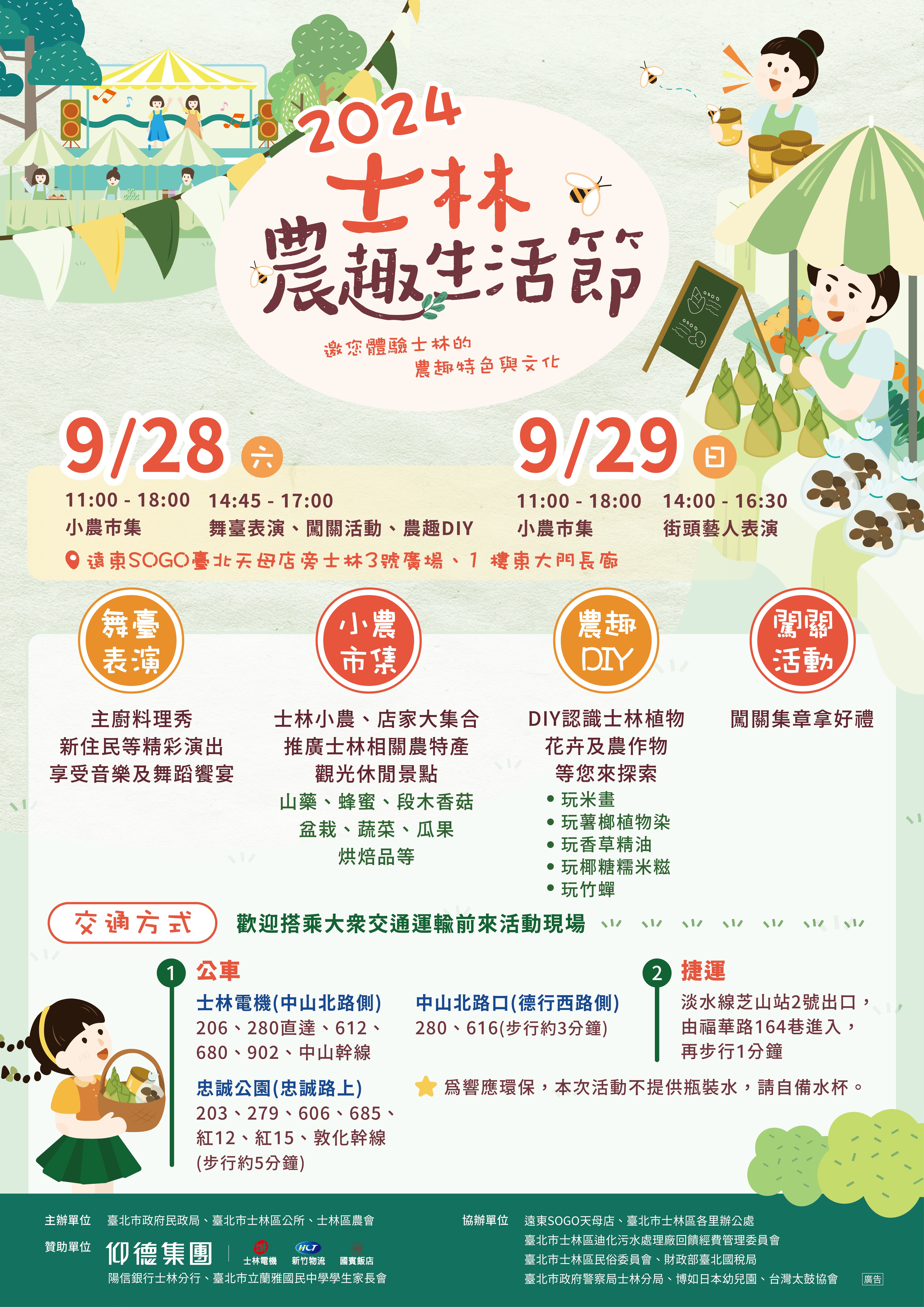 一、農趣文化,精彩無限!臺北市士林區公所將於113年9月28日(星期六)及29日(星期日)11時至18時,在遠東SOGO臺北天母店旁士林3號廣場與1樓東大門長廊首次舉辦「2024士林農趣生活節」!本次活動由士林區公所與士林區農會攜手合作,精心規劃豐富內容,邀民眾 一起體驗士林的農趣特色與文化。