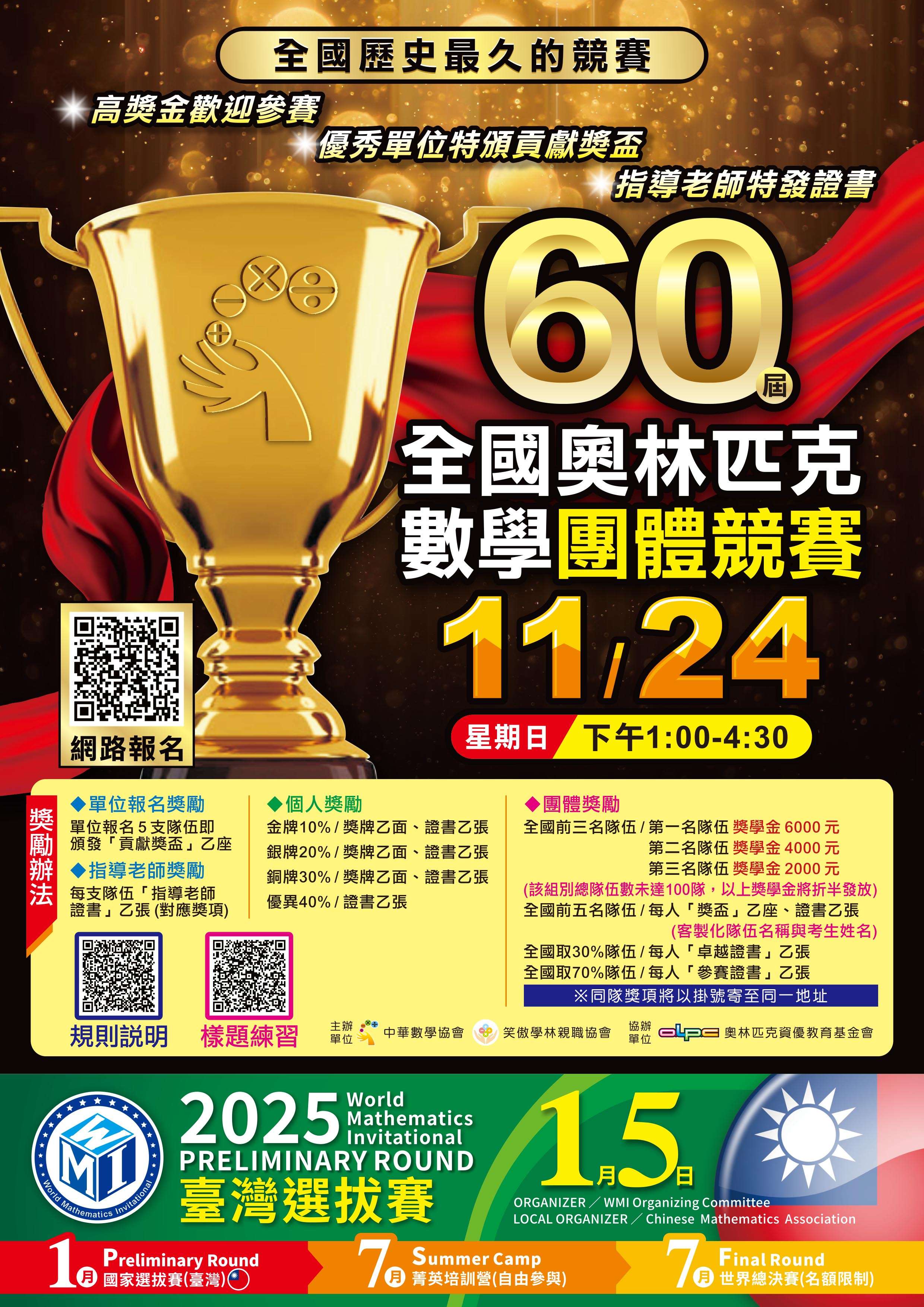 二、檢附「第60屆全國奧林匹克數學團體競賽」競賽活動相關簡章,供 貴校參閱。競賽報名的起訖時間為113年9月16日至113年10月7日止。