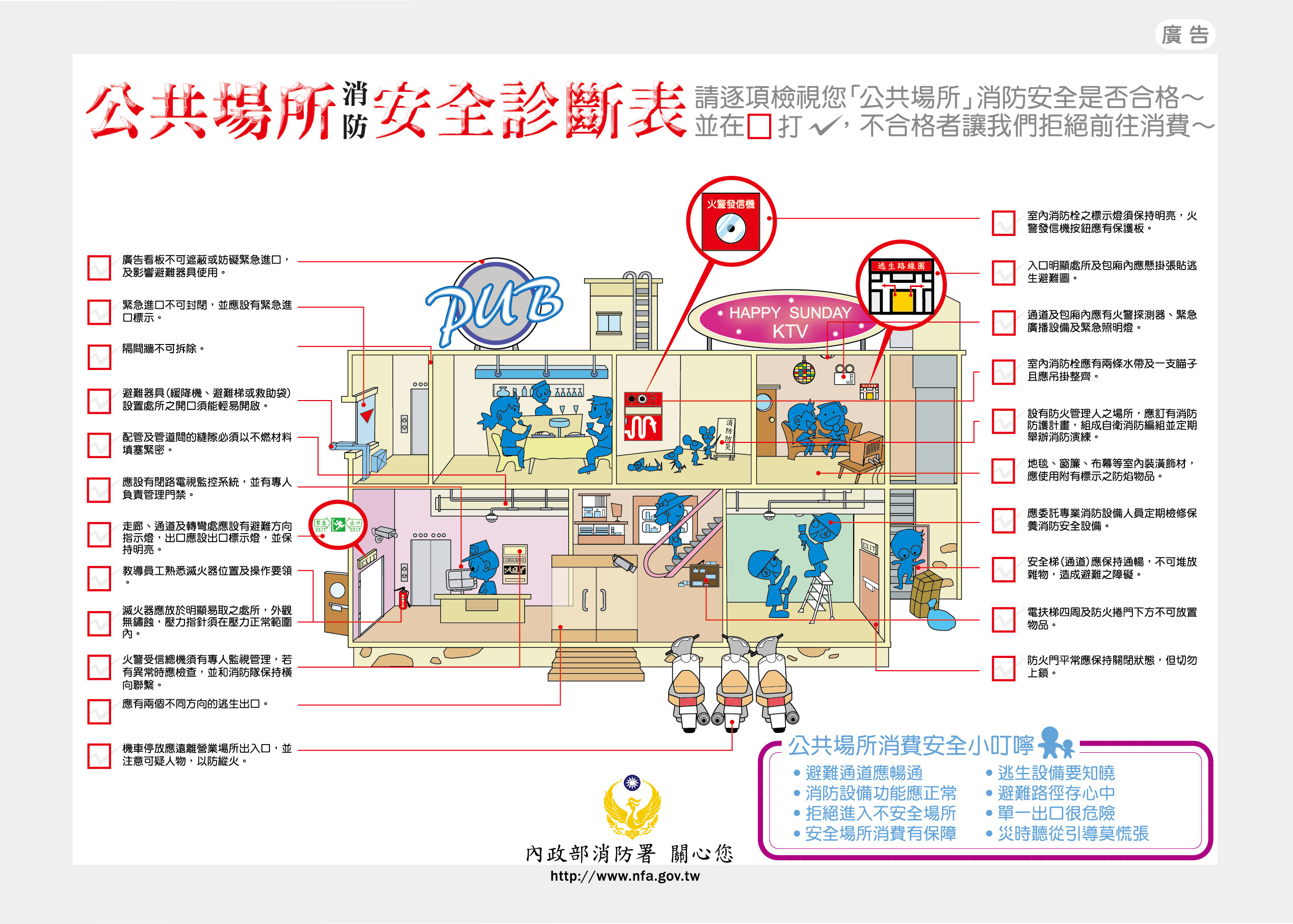 民眾進入公共場所應保持警覺,確認場所是否張貼 「不合格場所」告示,並留意消防安全設備位置及逃生動 線,以確保自身安全。