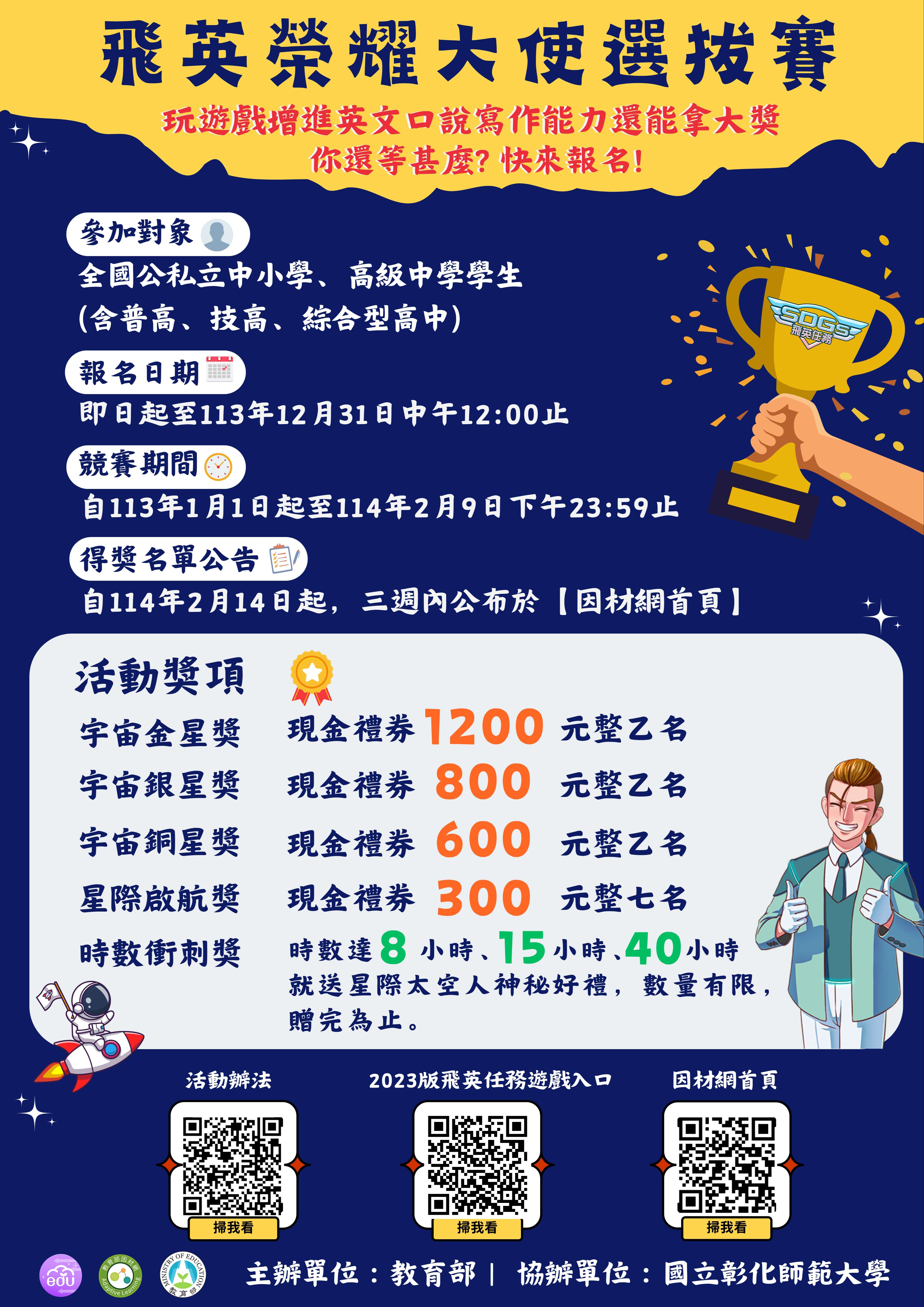 二、為提升全國中小學及高級中學學生英語口說與寫作能力, 教育部『高中英語文口說及寫作遊戲開發與推廣計畫』推 出「SDGs 飛英大使年度排行榜積分賽」,邀請學生成為 「飛英大使」。該遊戲式教材結合SDGs主題影片與互動任 務,旨在幫助學生提升聽力、口說及寫作能力,並激發持 續運用平台素材的英語學習動機。