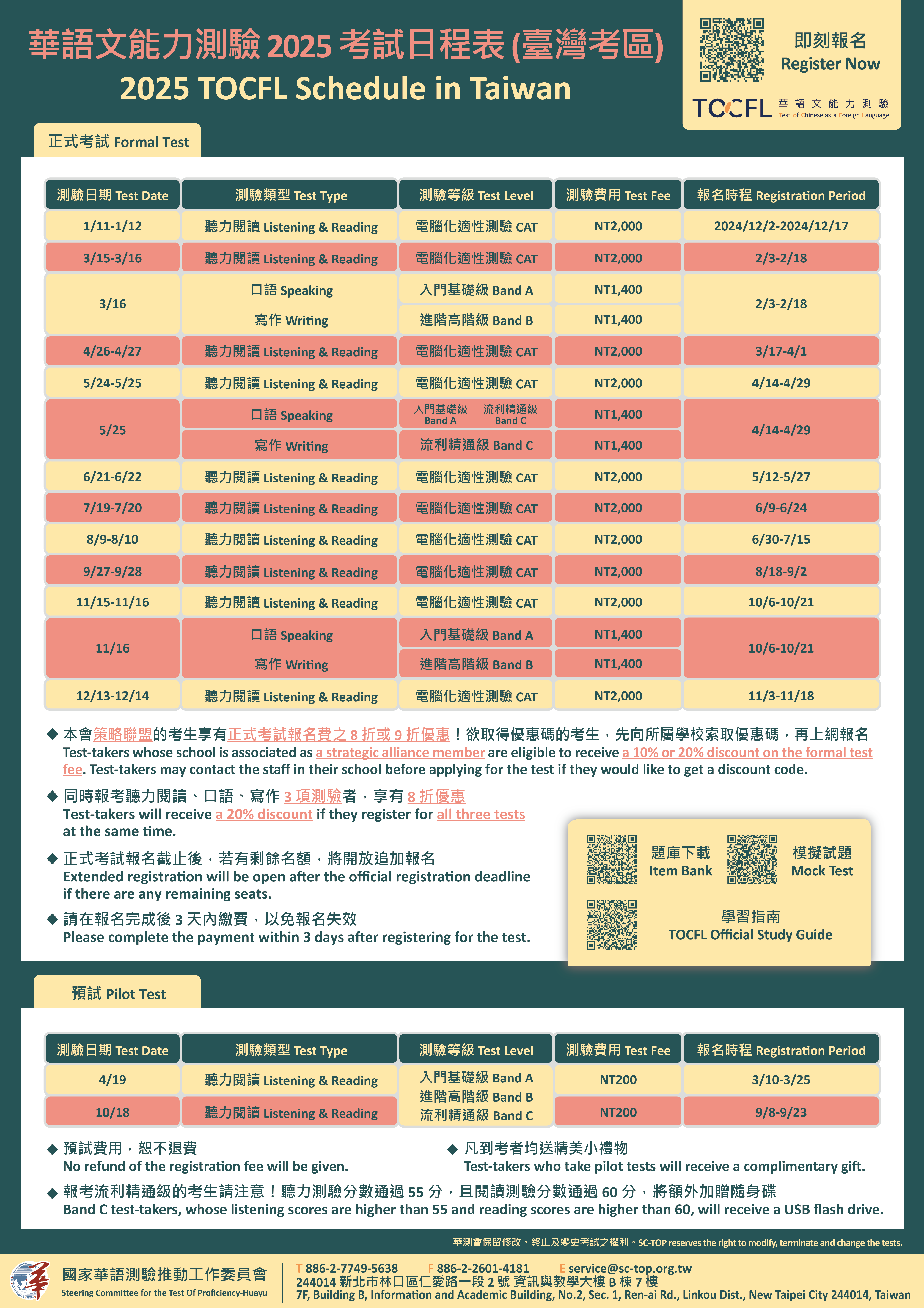 四、報名相關連結: (一)114 年正式考試日程表:https://reurl.cc/Kdppk9。 (二)114 年預試日程表:https://reurl.cc/36jjN0。 (三)線上報名系統:https://tocfl.edu.tw/TW/。