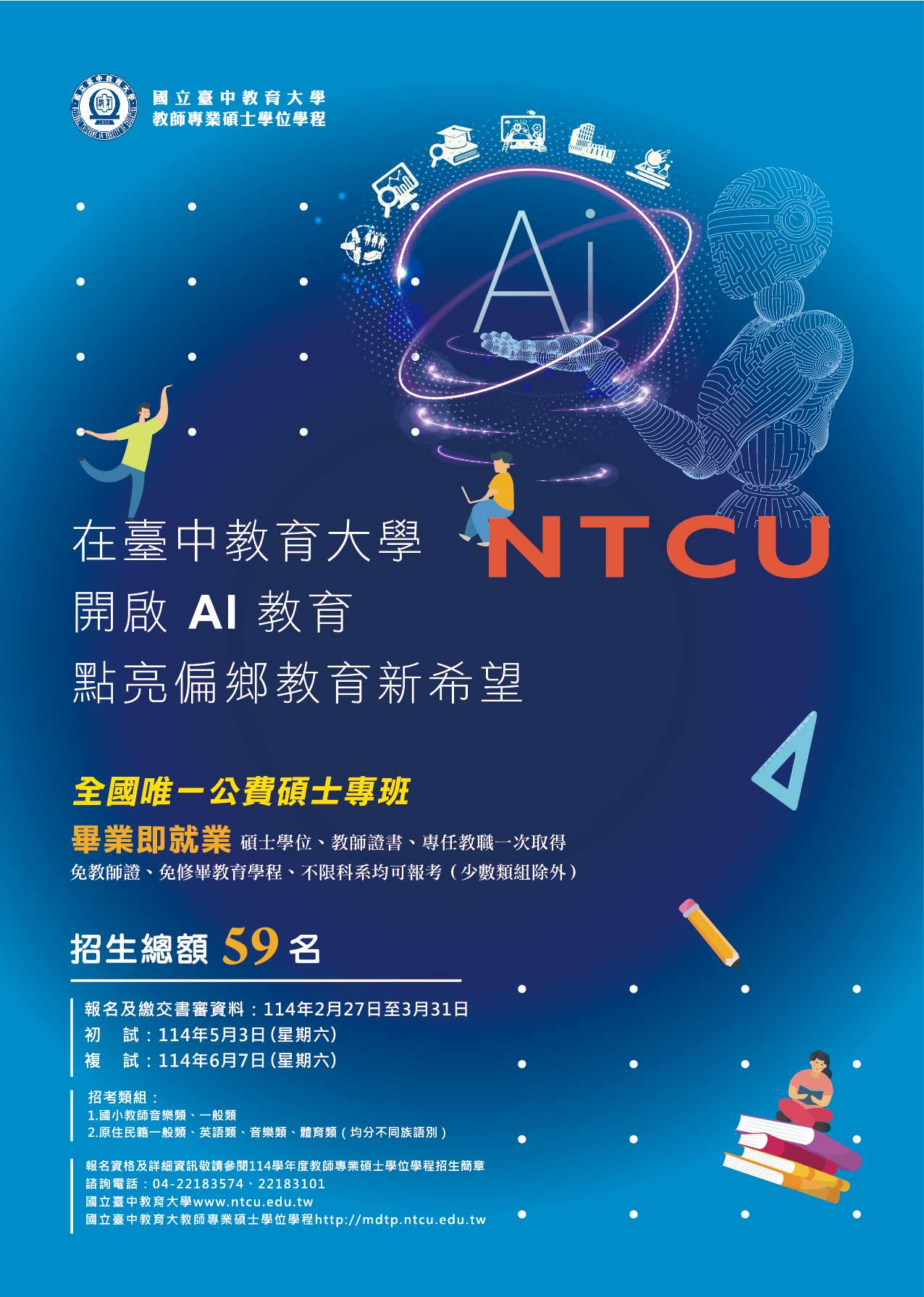 二、114學年度招生考試自114年2月27日至3月31日報名(含繳 交書審資料),5月3日初試,6月7日複試,招生簡章請參 閱本校招生資訊網(https://as.ntcu.edu.tw/)。
