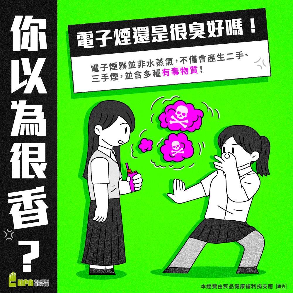 電子煙多含有尼古丁及有害致癌物,對使用者和暴露於二手煙者都有害,更沒有證據證明電子煙是安全且可以幫助戒菸。另外,國外研究顯示,曾經使用電子煙的青少年會有較高的吸菸意圖,且易開始有吸菸行為,青少年若曾使用過電子煙,其嘗試紙菸的機會是沒有使用過電子煙青少年的2倍以上,雙重使用對身體危害更甚,且更難以戒除。