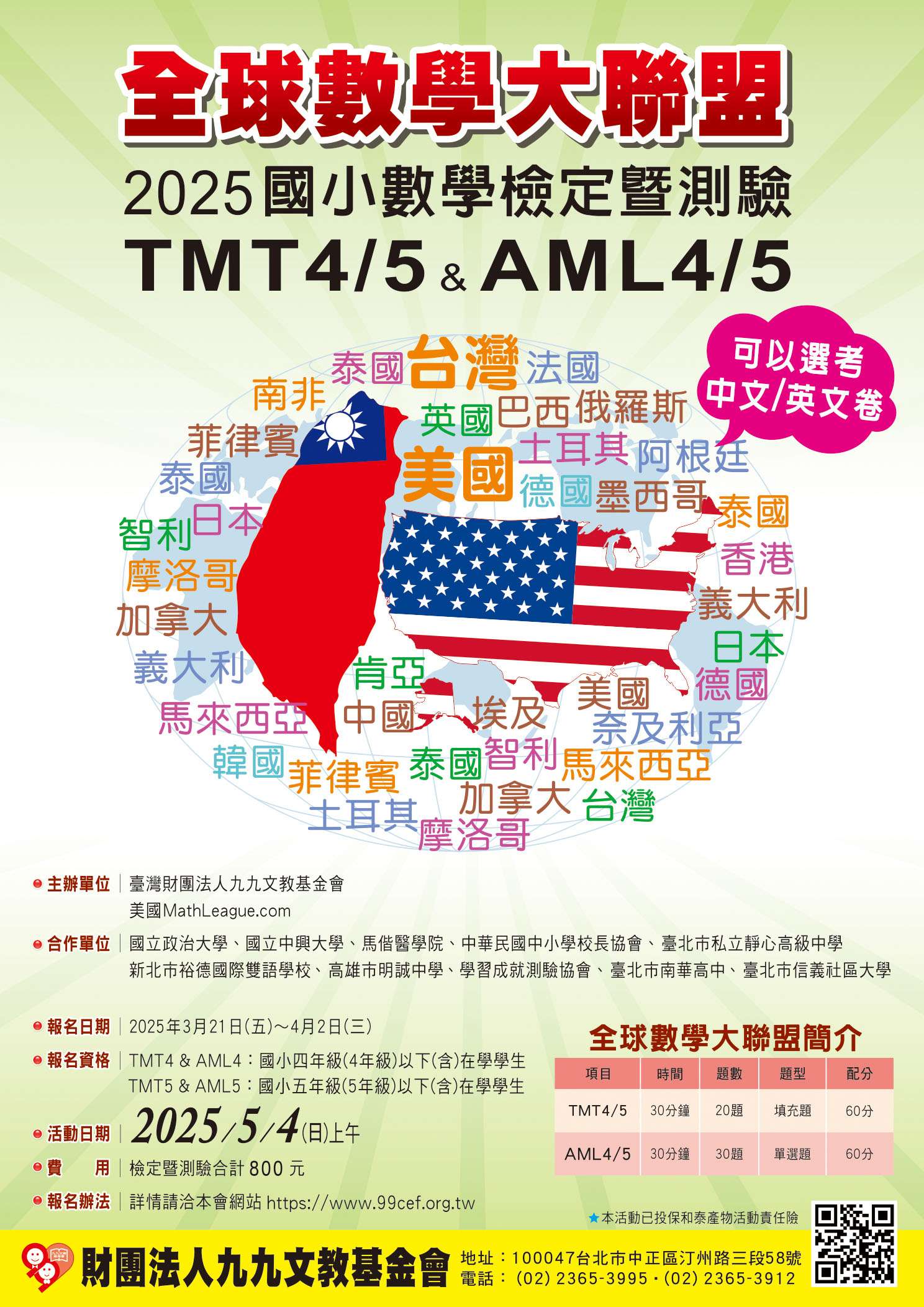 二、報名資格: (一)TMT4 & AML4:全國小學四年級(含)以下在學學生 (二)TMT5 & AML5:全國小學五年級(含)以下在學學生