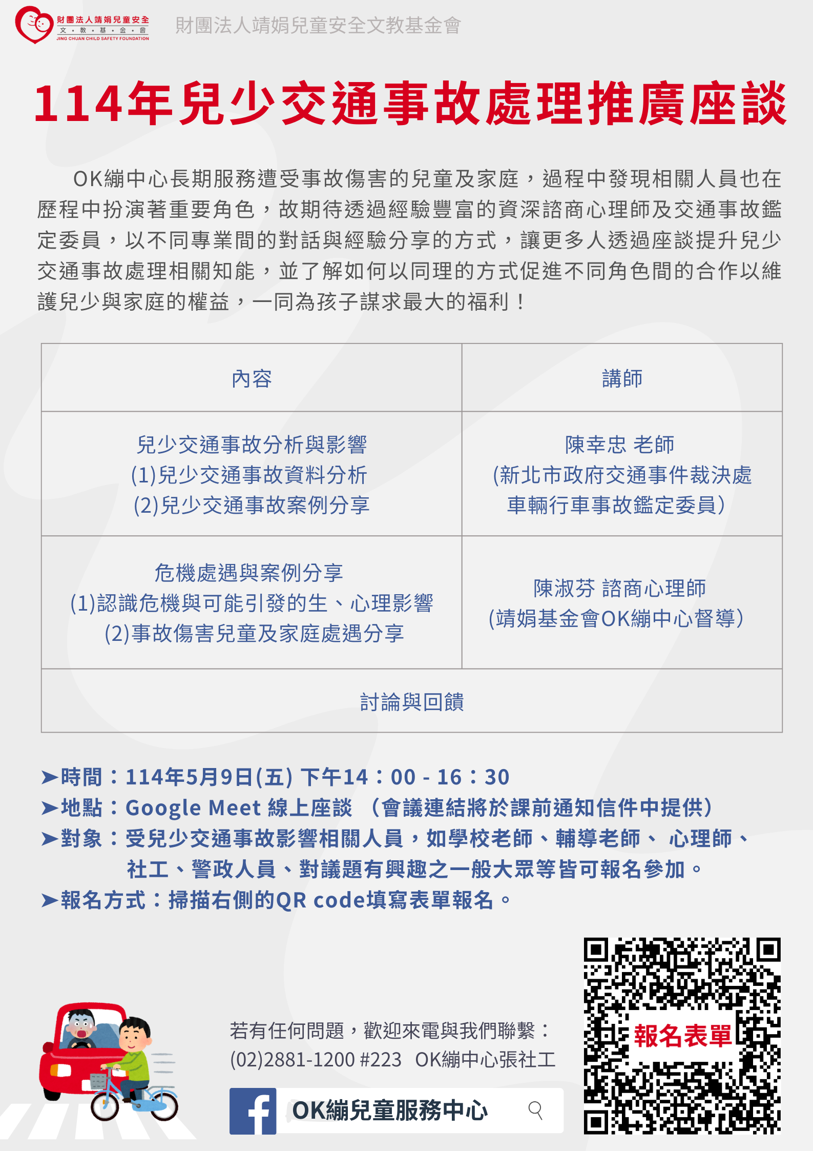 靖娟基金會OK繃兒童服務中心於114年5月9日14時至16時30 分,採線上方式辦理「兒少交通事故處理推廣座談」,期 待透過對話方式從交通、心理、社會等角度分享中心協助 處理交通事故的服務經驗傳達給更多相關工作者,讓不同 專業之間以同理的態度更了解彼此,一同協助為孩子謀取 最大的利益。