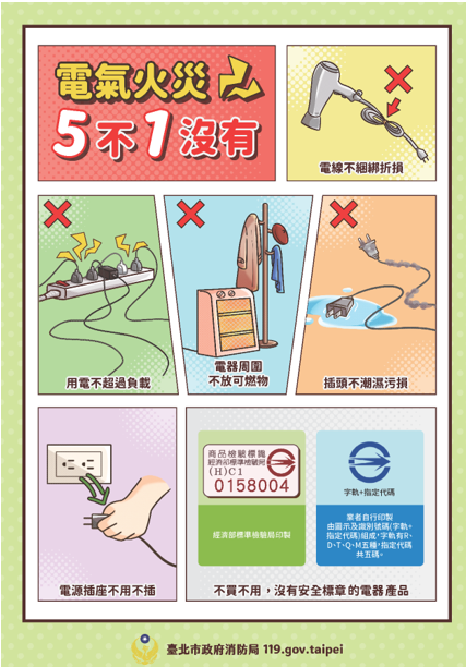 家裡電燈閃爍變暗?電線過燙有異味?這些都是電氣火災的前兆預防電氣火災,請牢記5不1沒有原則,電線不綑綁折損、用電不超過負載、電器周圍不放可燃物、插頭不潮濕汙損、電源插座不用不插、不買不用沒有安全標章的電器產品