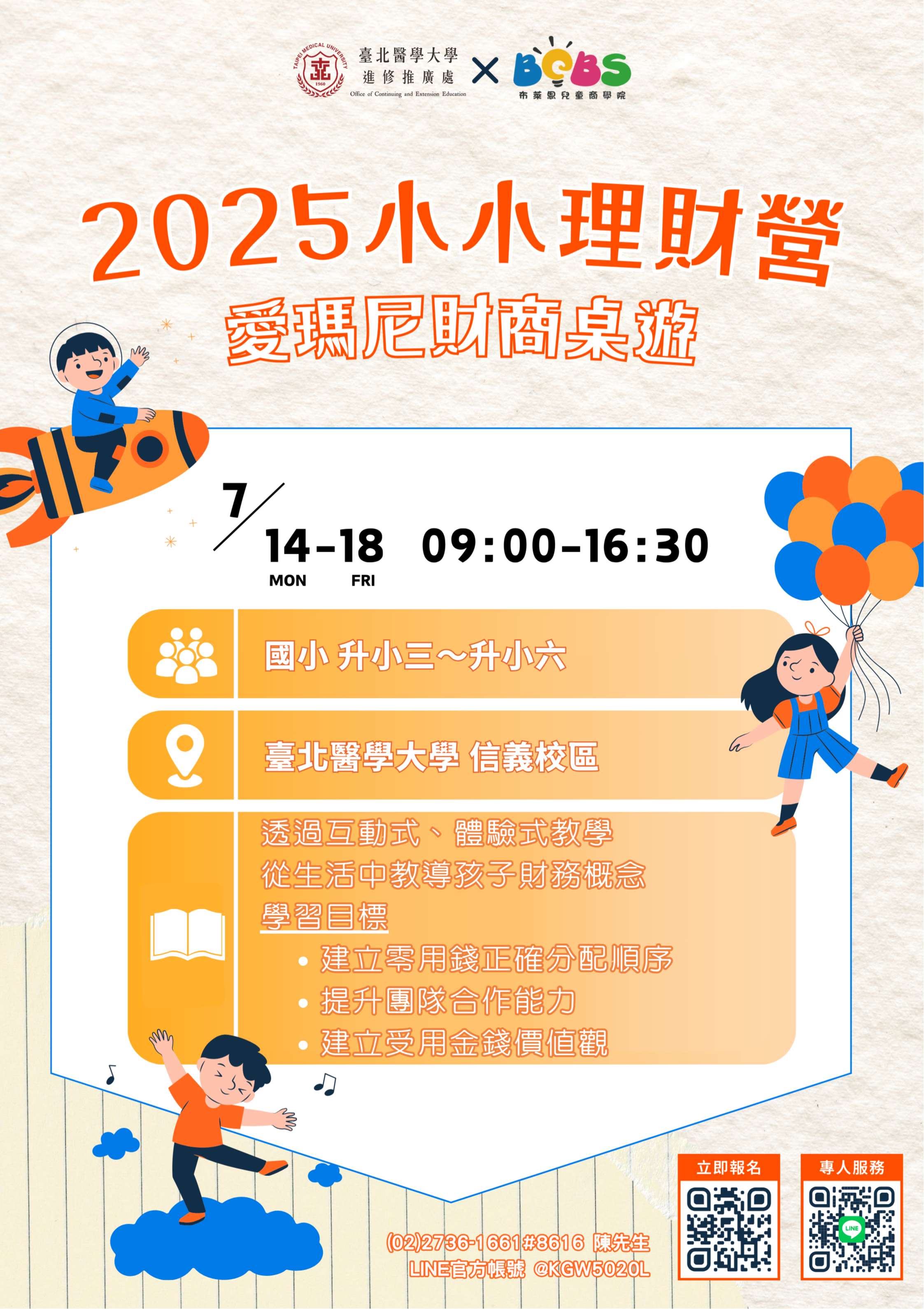 (二)小小理財營-愛瑪尼財商桌遊 114年7月14日至114年7月18日,共5天,09:00- 16:30。