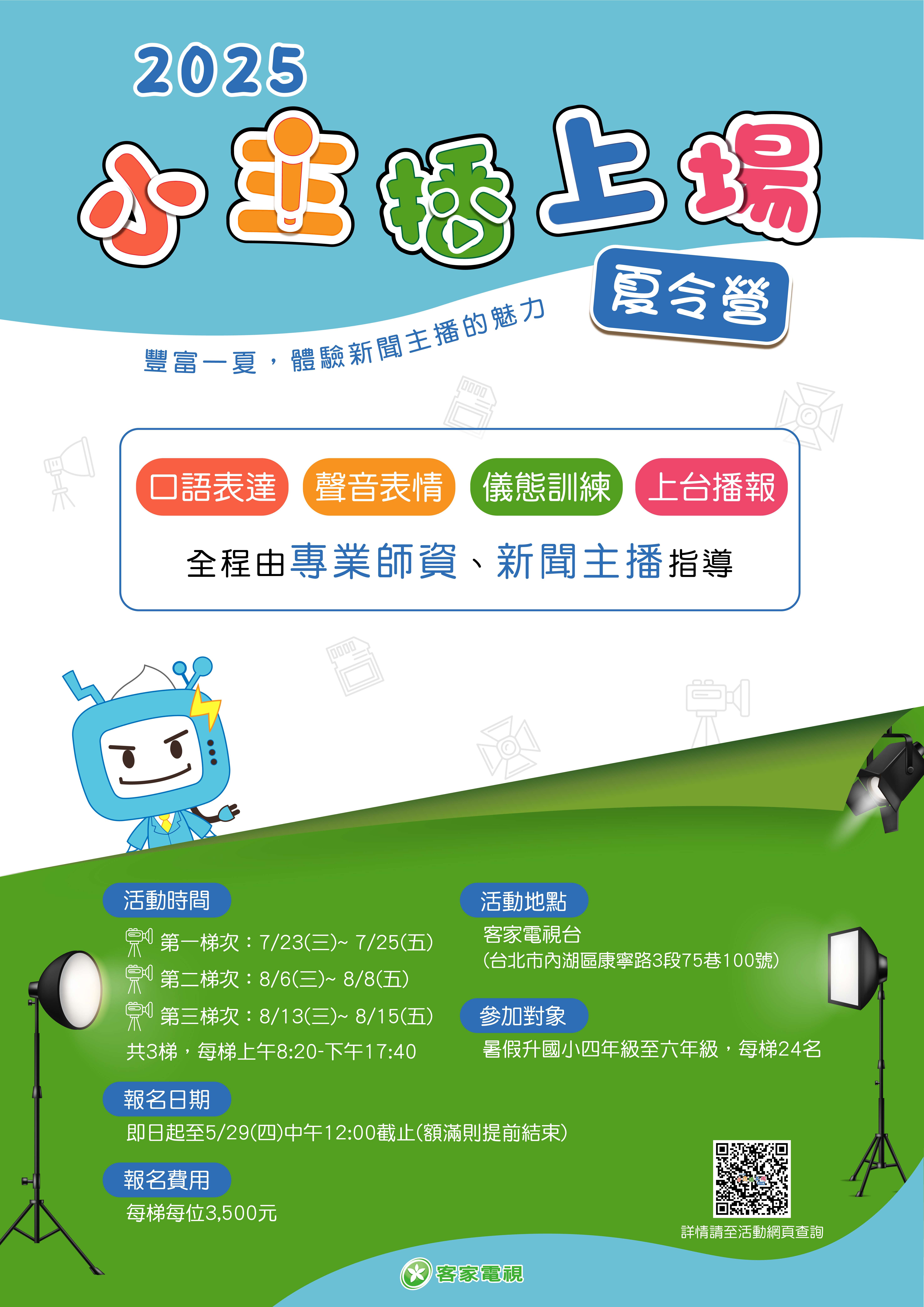 一、為增進學童媒體素養、語言表達能力及團隊合作精神,並 透過分組學習與實際演練,體驗新聞製作及主播播報技 巧,本會客家電視特於暑期舉辦「2025客家電視小主播上 場夏令營」,針對暑期後國小四到六年級學生設計內容, 並邀請專業講師及新聞主播進行授課。