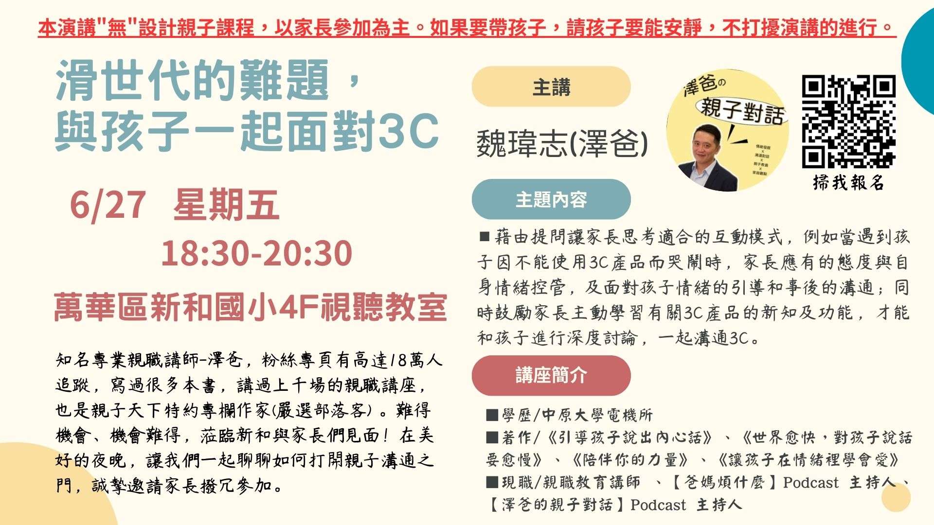 講座主題:滑世代的難題,與孩子一起面對3C (一)講師:魏瑋志先生(澤爸) (二)日期:114年6月27日(星期五) (三)時間:晚上6:30-8:30 (四)地點:萬華區新和國小4F視聽教室