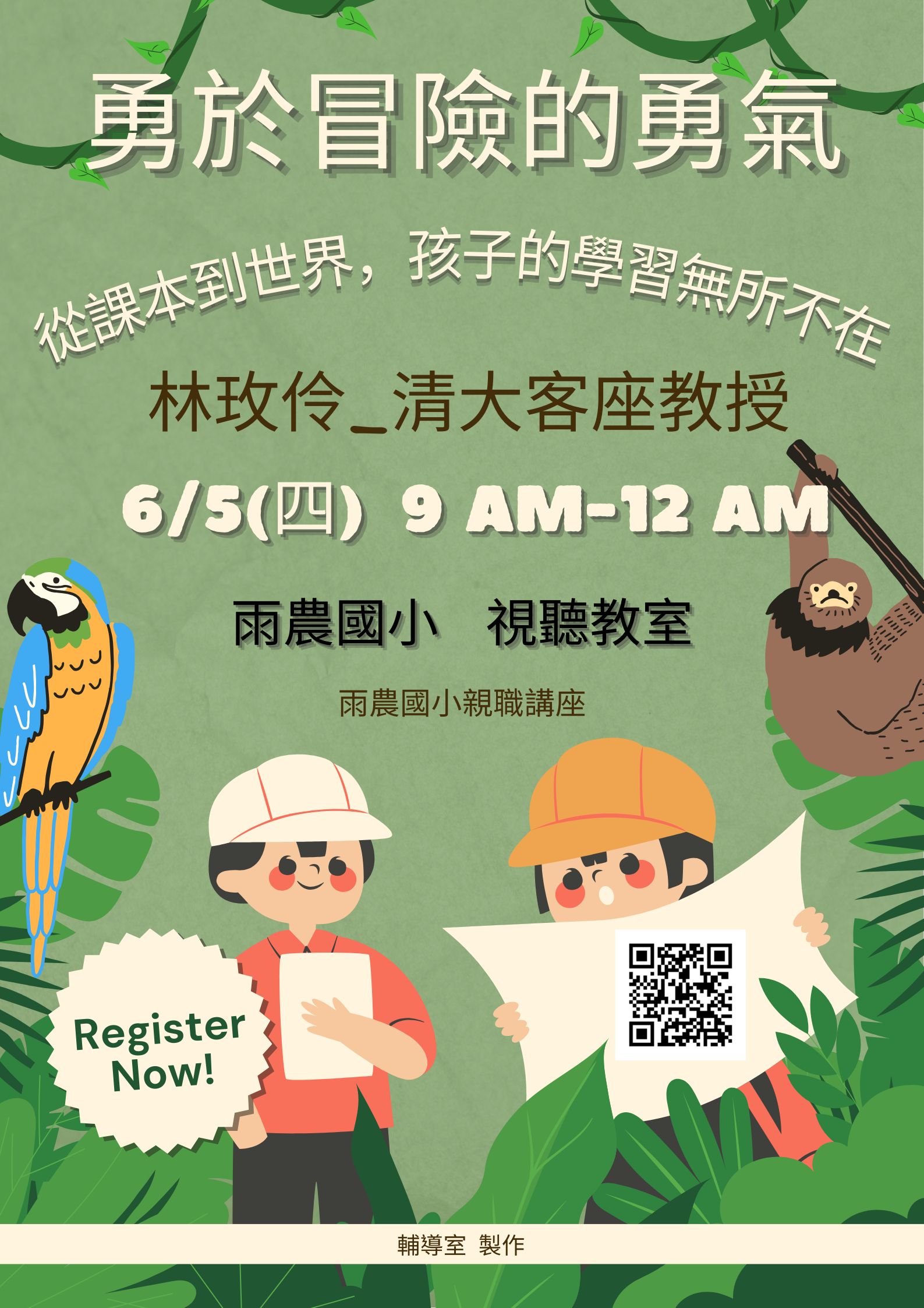 (一)時間: 6月5日(星期四)上午9:00-11:30 (二)講座:林玫伶(清大客座教授)。 (三)講題:「勇於冒 險的勇氣:從課本到世界,孩子的學習 無所不在」。 (四)地點:雨農國小活動中心一樓視聽教室。 (五)講座活動報名連結:https: //forms.gle /vc9BHyusgBeEDbVcA