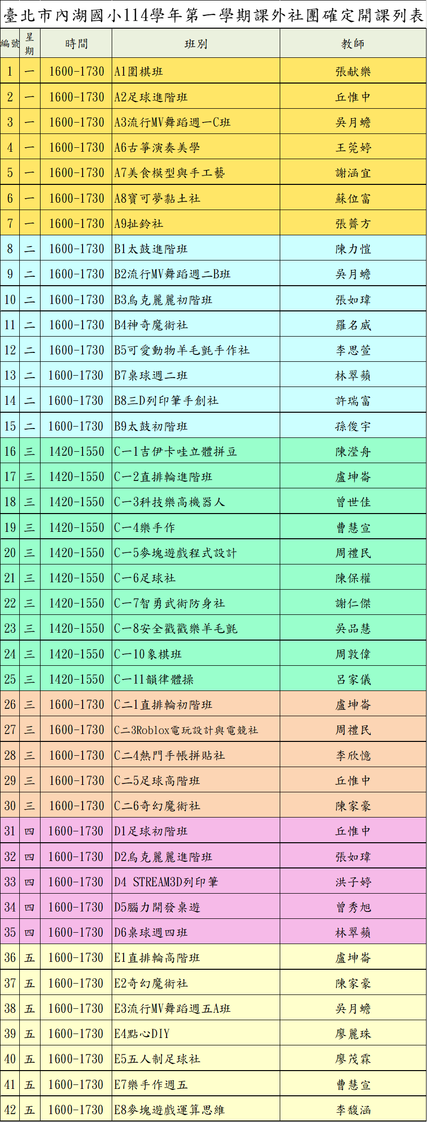 週一A4創意繪本班、A5絢麗手工藝社;週三C一9造型氣球、C二2智勇武術擊棍社、C二10AI未來城市創造社;週四D3自然花藝美學創造社。