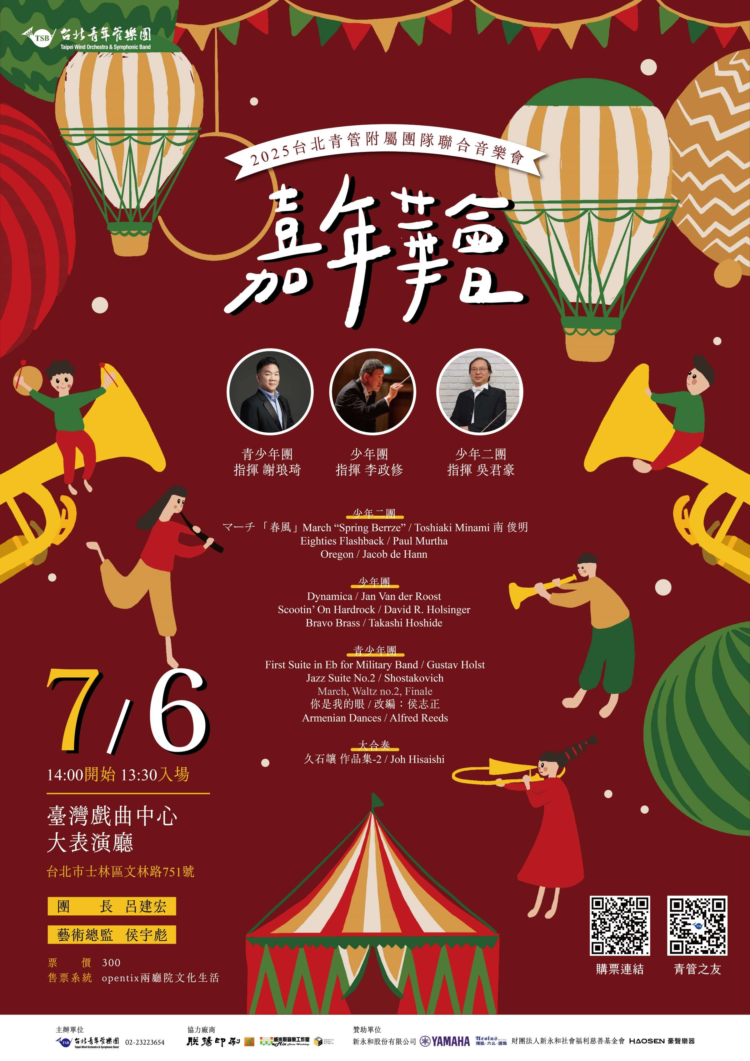 一、2025台北青管附屬團隊聯合音樂會《嘉年華會》,由謝琅琦、李政修與吳君豪3位老師,指揮台北青管附屬團隊演出,帶來一連串耳熟能詳的管樂經典曲目。