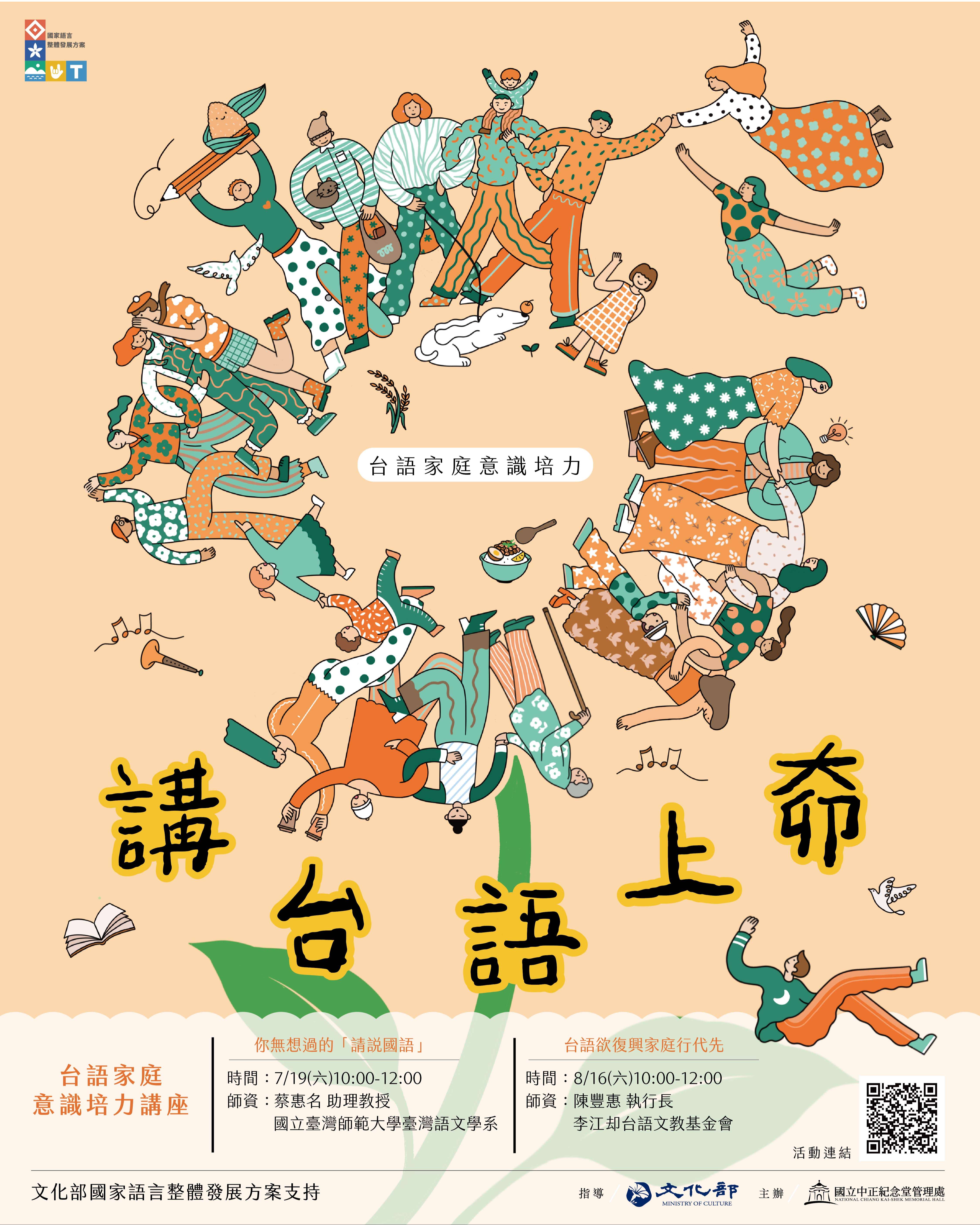 (二)台語家庭意識培力講座─「在家播種台語文化種子」: 「家庭」是語言扎根的最佳場域,透過講師經驗分享, 讓家庭成員了解台語的歷史文化與價值觀念,以及應該 如何在家庭中推廣台語,促進台語的代間傳承。