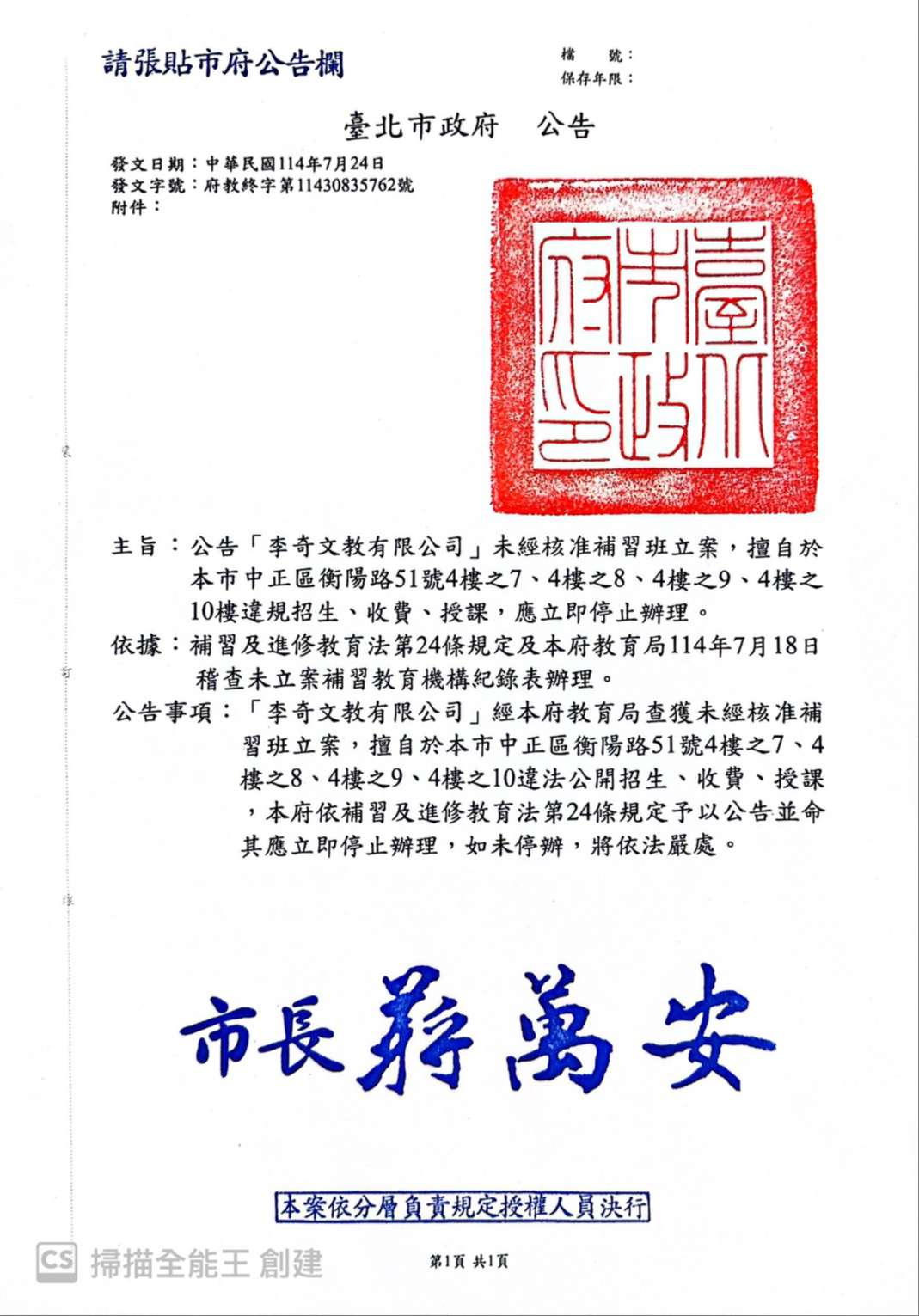 二、「李奇英文」(李奇文教有限公司)經本局查獲未經核准補習班立案,擅自於本市中正區衡陽路51號4樓之7、4樓之8、4樓之9、4樓之10樓違法招生、收費、授課,經市府依補習及進修教育法第24條規定裁處及公告,並命其立即停止辦理。