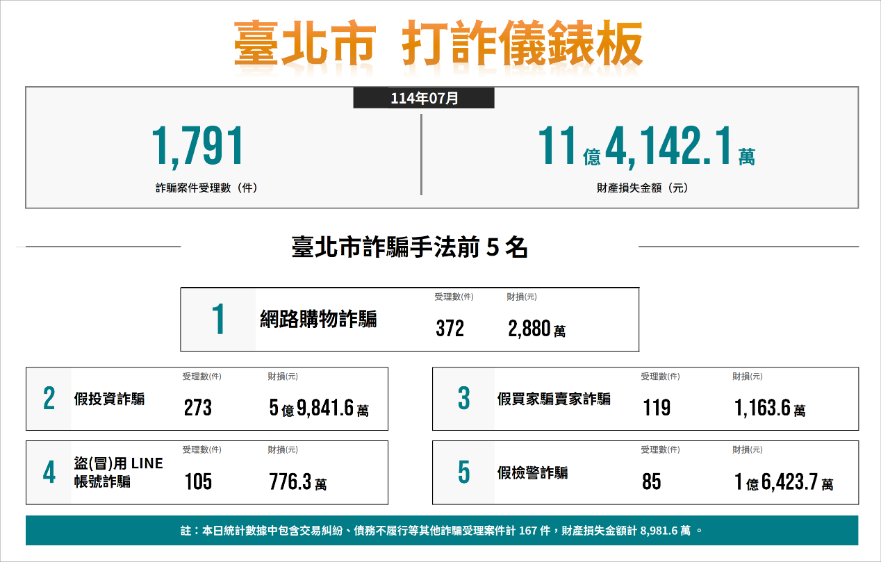 經分析本市114年7月各類詐欺案件發生數共計1,791件,財 損金額新臺幣(以下同)11億4,142.1萬元,前三大高發詐 欺手法受理件數及財損金額: