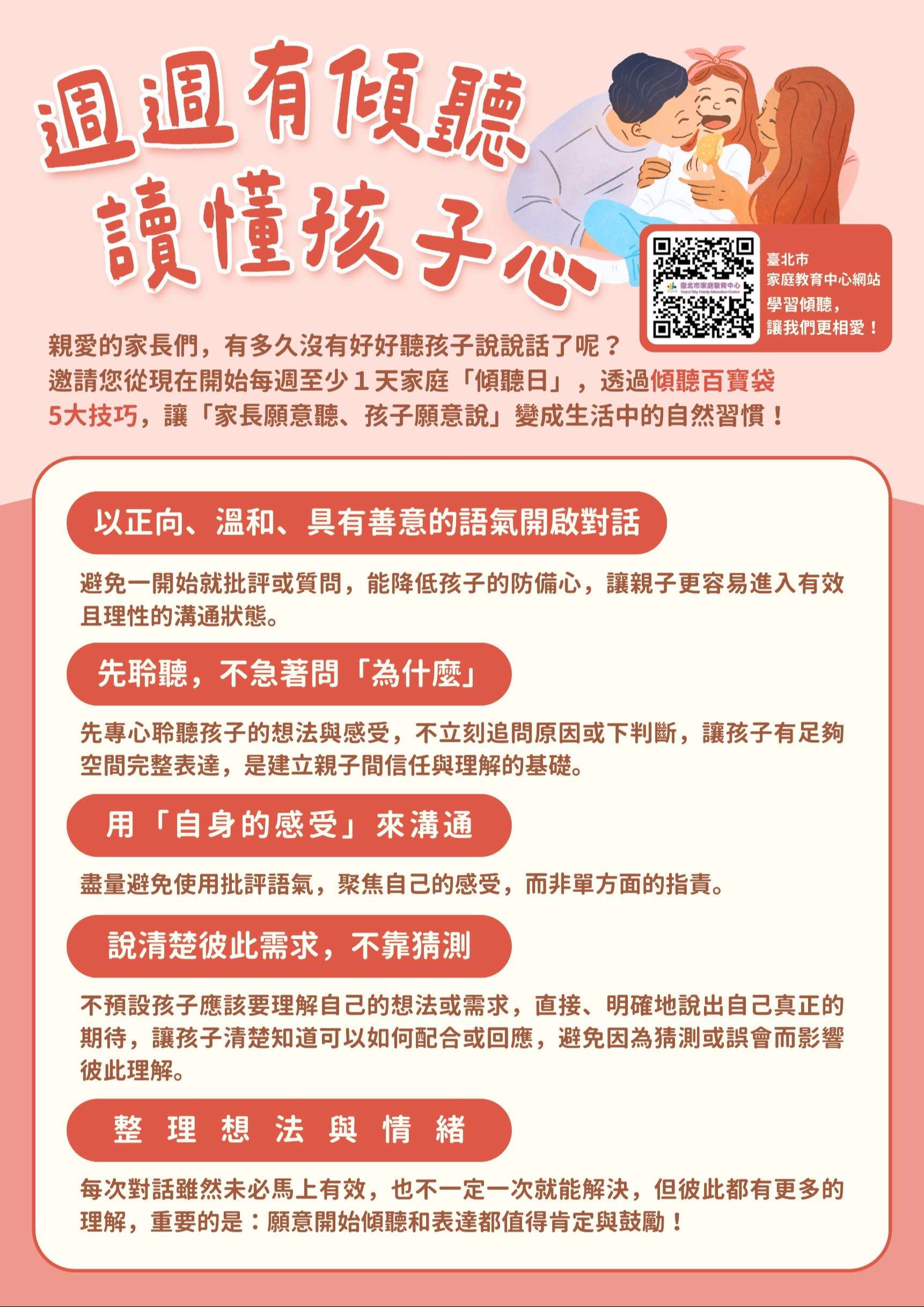 為打造「家長願意聽,孩子願意說」的環境,鼓勵所有家 長每週至少撥出一天為家庭「傾聽日」,暫時放下手邊的 忙碌,專心聽孩子內心的聲音,透過「傾聽百寶袋」5大技 巧,協助家長有效實踐傾聽,促進親子間雙向溝通與情感 交流。