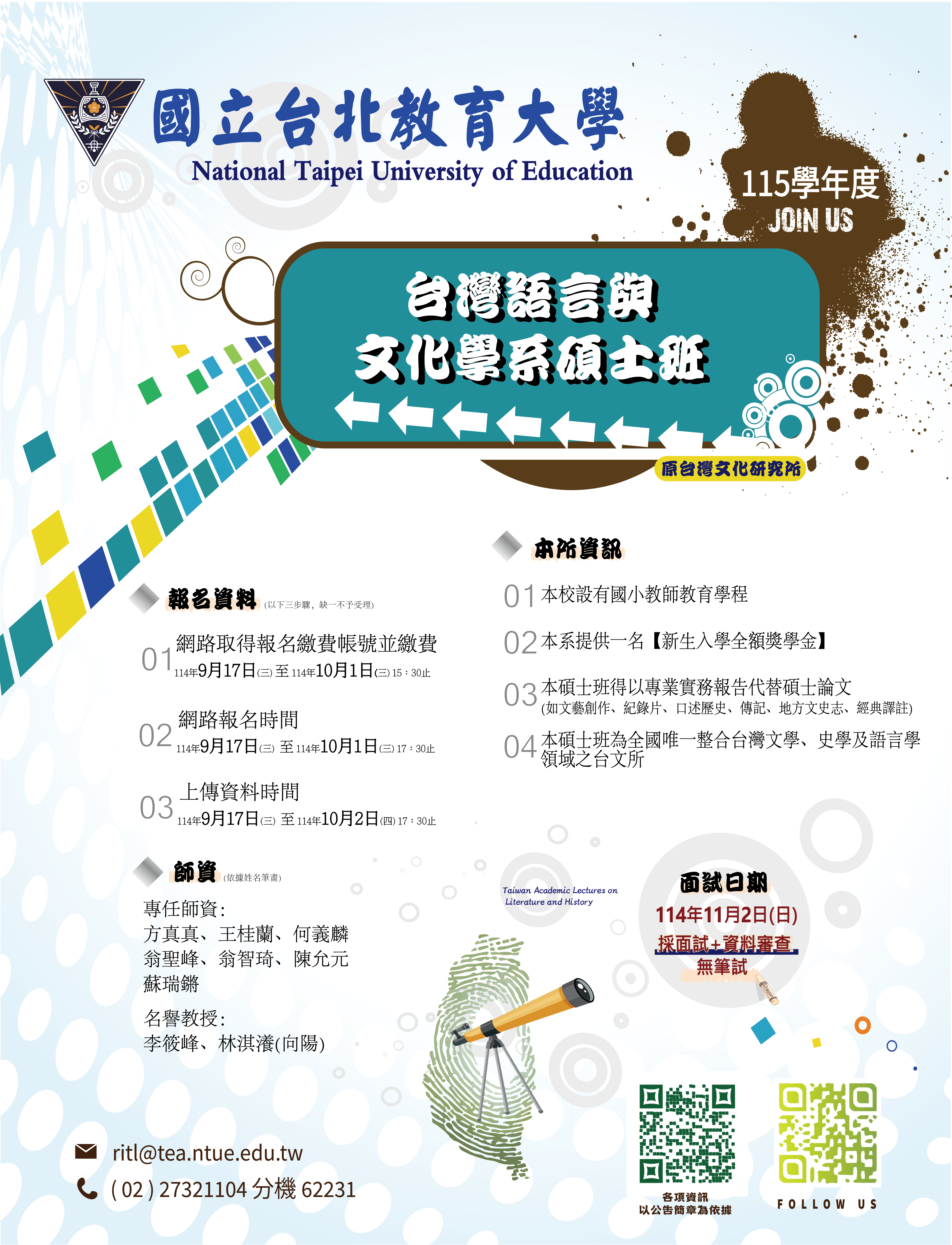 一、報考資訊: (一)網路取號繳費:114年9月17日(三)9:00至114年10月1日 (三)15:30止。 (二)網路報名填表:114年9月17日(三)9:00至114年10月1日 (三)17:30止。 (三)上傳資料截止時間:114年9月17日(三)9:00至114年10月 2日(四)17:30止。 (四)面試日期:114年11月2日(日)。 (五)招生名額:文學組8名、史學組8名。 (六)簡章下載:http://exam.ntue.edu.tw/index_E.html