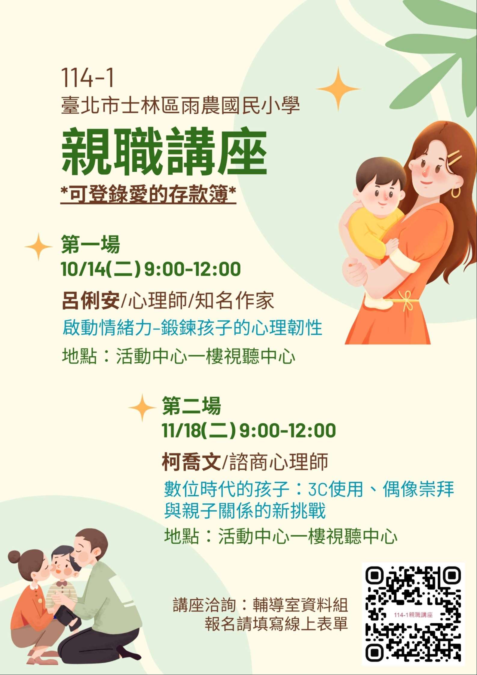 一、雨農國小10至11月共計辦理兩場親職講座課程,結合愛的存款簿學習集點活動給予時數。講座課程內容如下: