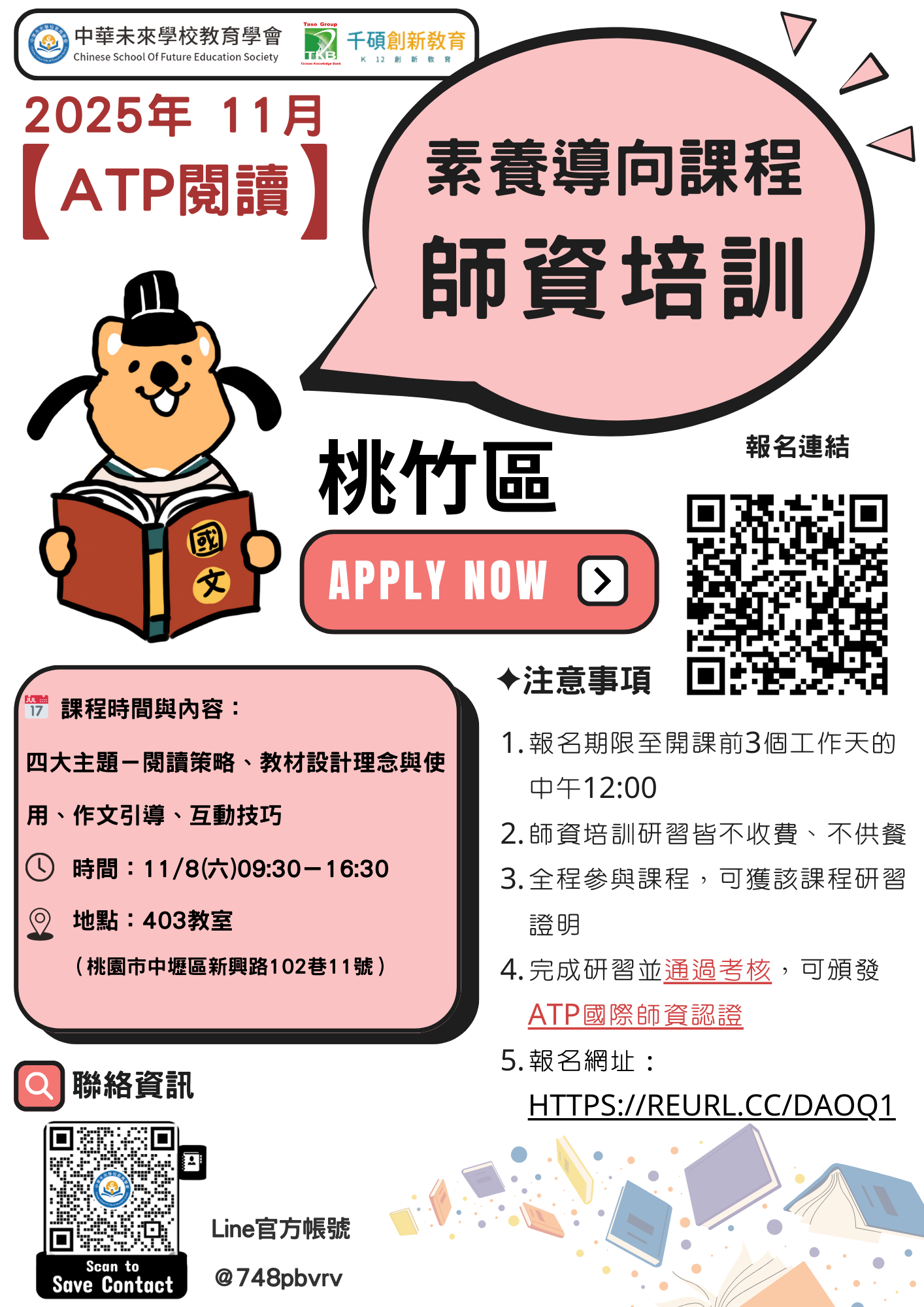 一、為提升教師素養導向教學能力,強化閱讀理解教學專業, 本會特辦理「ATP素養導向閱讀師資培訓工作坊」。