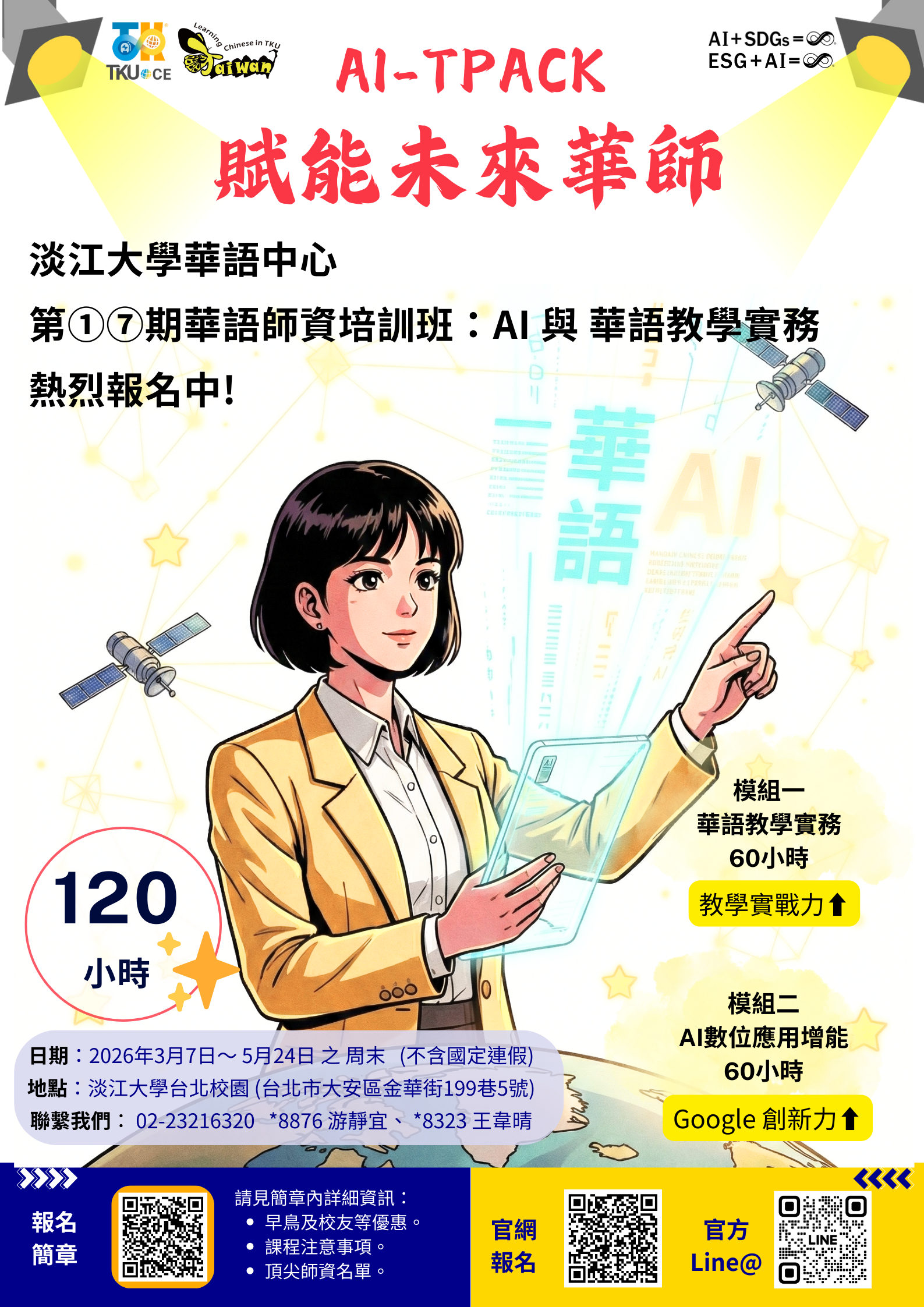 三、課程資訊: (一)日期:115年3月15日至5月24日期間之週六、週日。 (二)地點:本校台北校園(臺北市大安區金華街199巷5 號)。 (三)對象:對華語教學、AI數位應用有興趣之教師、社會人 士,或大專院校在校生。(四)方式:採線上報名,詳情請參閱附件招生簡章,或至本 校推廣教育處官網(https://www.oce.tku.edu.tw/)查 詢。