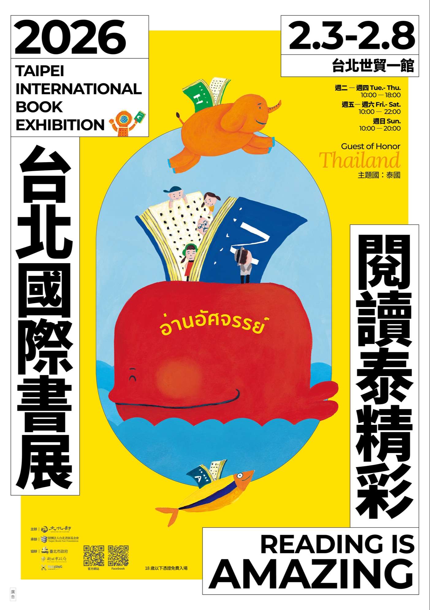 一、旨揭活動係由文化部主辦,財團法人台北書展基金會承辦,由本府擔任協辦單位,將於今(115)年2月3日至2月8日假台北市世貿中心展覽一館舉辦,以「閱讀泰精彩, Reading is Amazing」為主題,主題國為「泰國」。活動詳情請至台北國際書展官網查詢( https://www.tibe.org.tw/)。