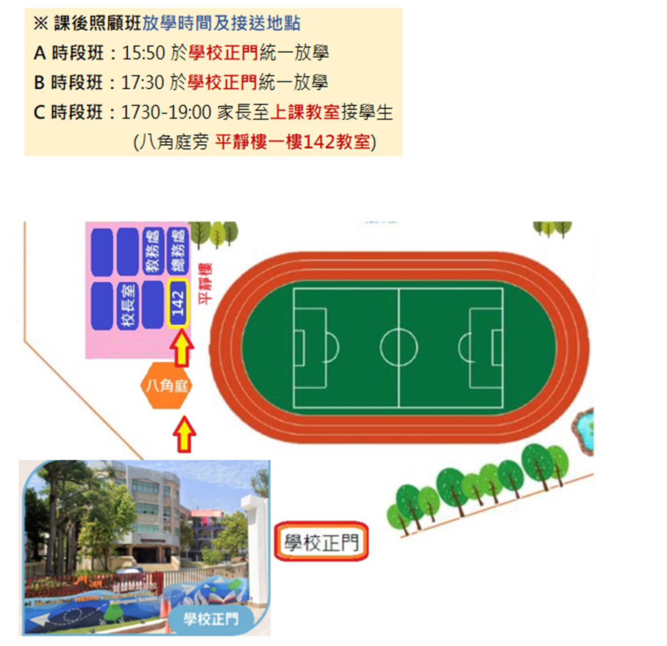 三、A、B時段學生放學,由課後班老師帶至正門統一放學,等候家長接走;C時段班學生,請家長於1730-19:00 至上課教室接學生。