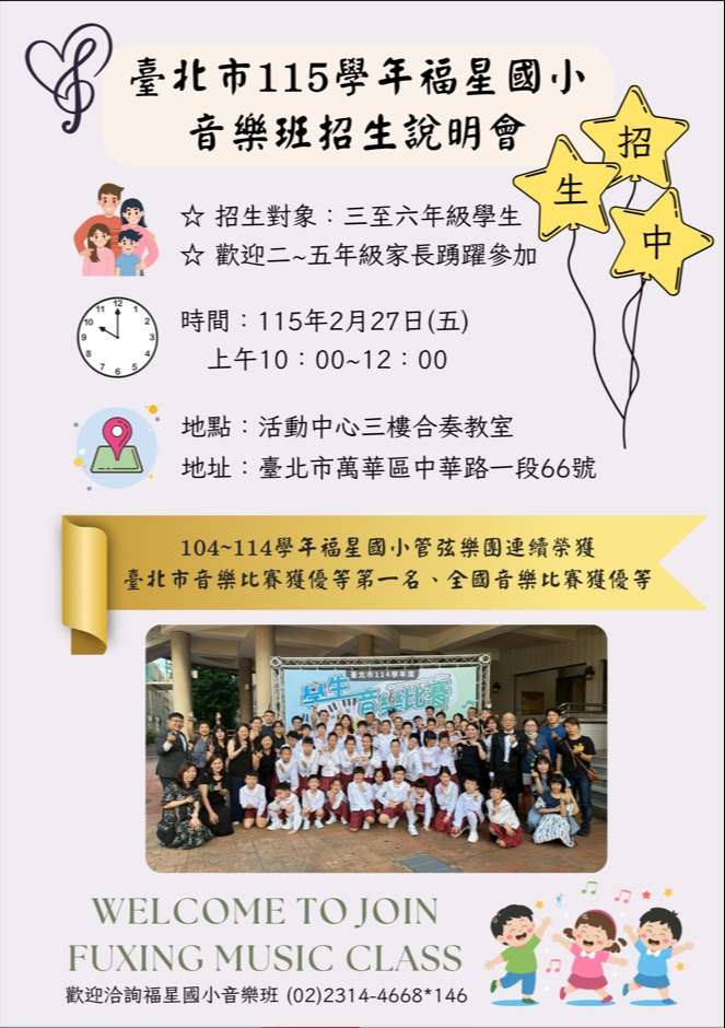 一、臺北市萬華區福星國民小學今年承辦臺北市115學年度國民小學藝術才能音樂班招 生。