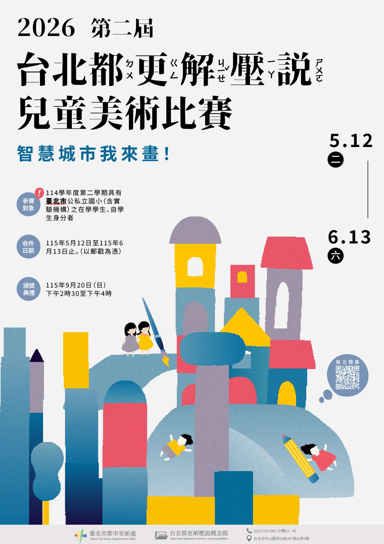 二、旨揭比賽徵件對象為本市114學年度第2學期在學之國小學 生;徵件期間自115年5月12日起至115年6月13日止。本活 動採團體及個人報名雙軌制,請貴校惠予透過官方網站、 公佈欄等管道協助公告,並轉知校內師生踴躍參與。